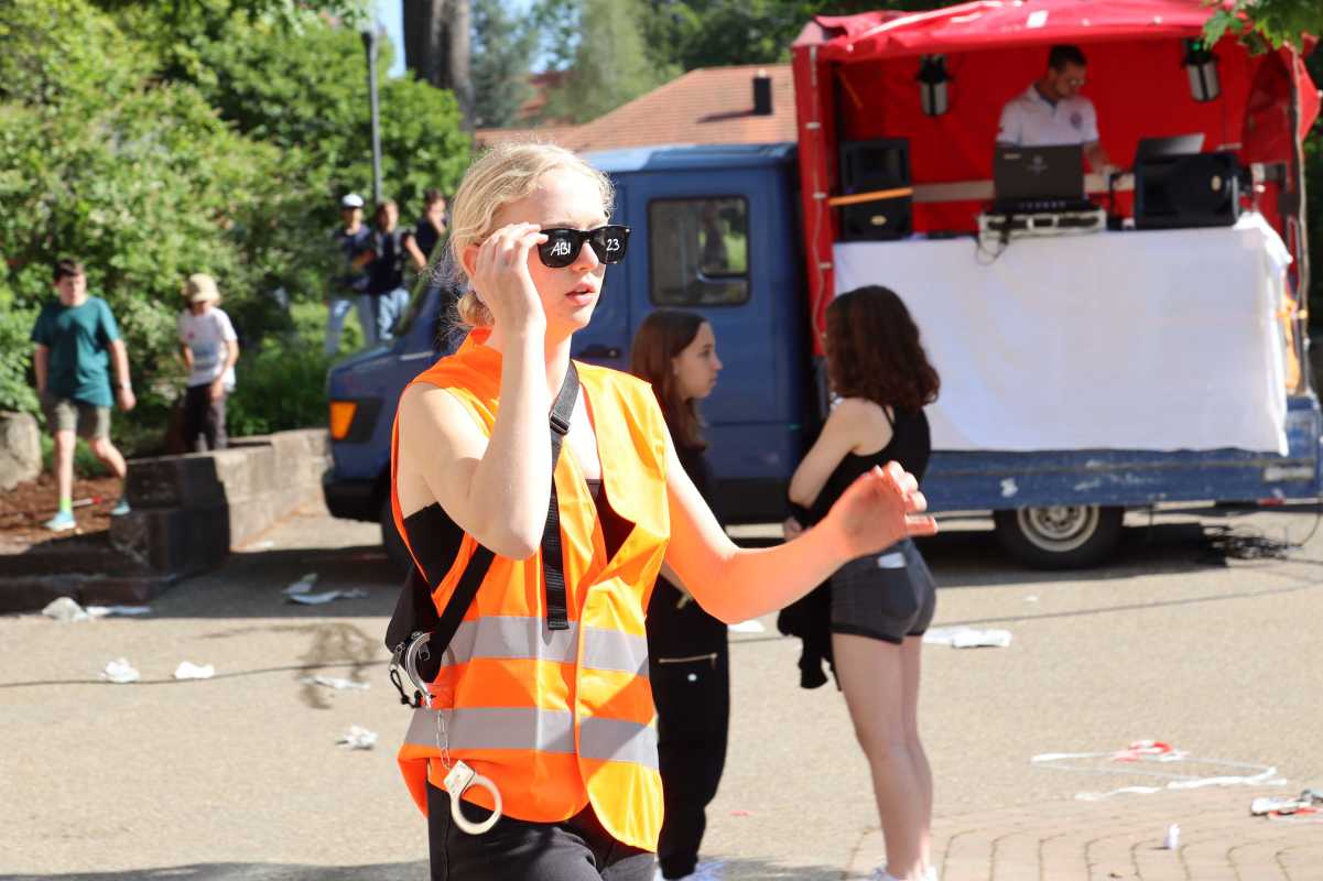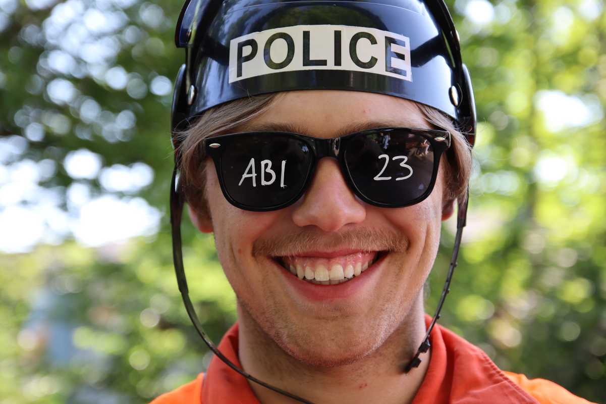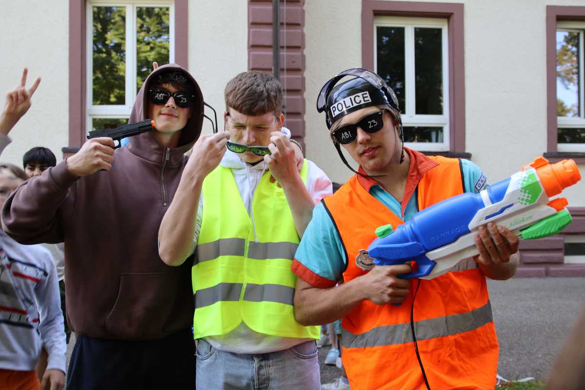 Good cop, bad cop – alles eine Frage der Perspektive. Beim diesjährigen Abistreich hatten sich die Absolventen als Polizisten verkleidet, die als erste Amtshandlung mit Wasserpistolen bewaffnet die Lehrer „verhafteten“. Sie durften sich einen Anwalt suchen und mussten auf dem Schulhof bei ihrer „Verhandlung“ fachbezogene Fragen beantworten, etwa nach der Höhe der Freiheitsstatue, Rechenaufgaben lösen oder sich sportlich betätigen.
