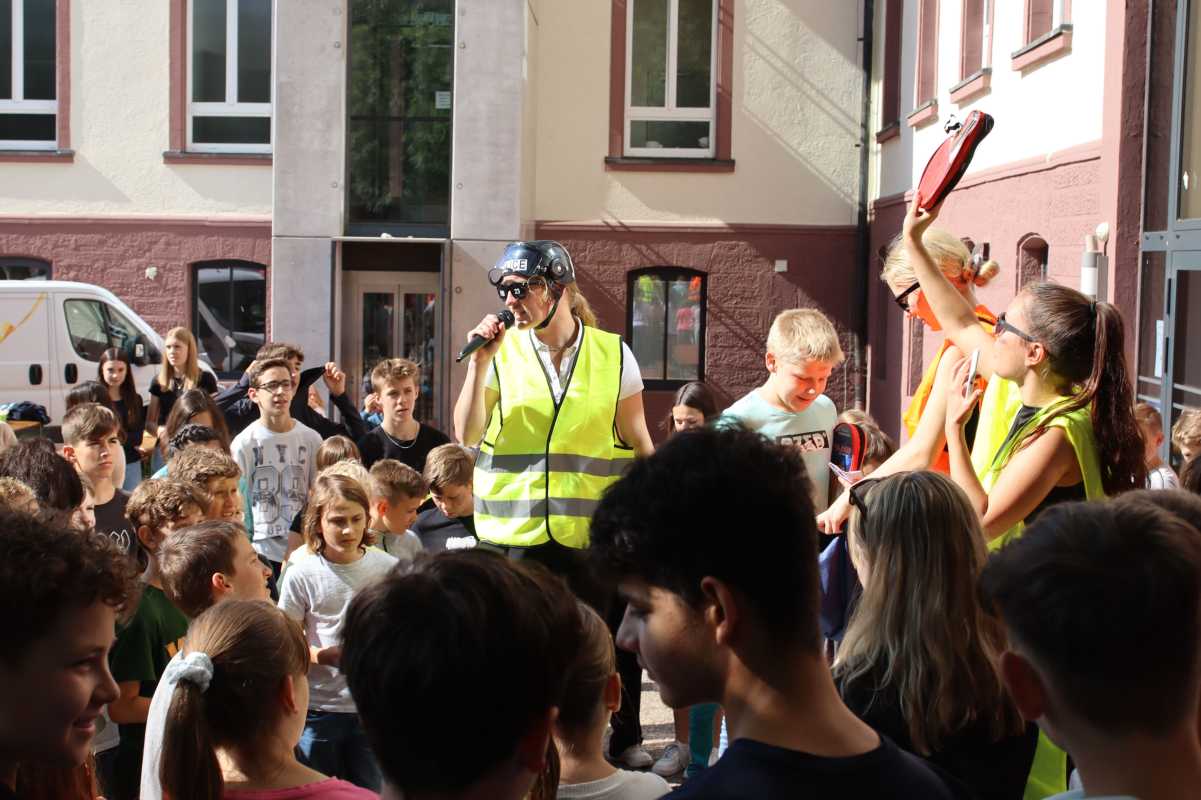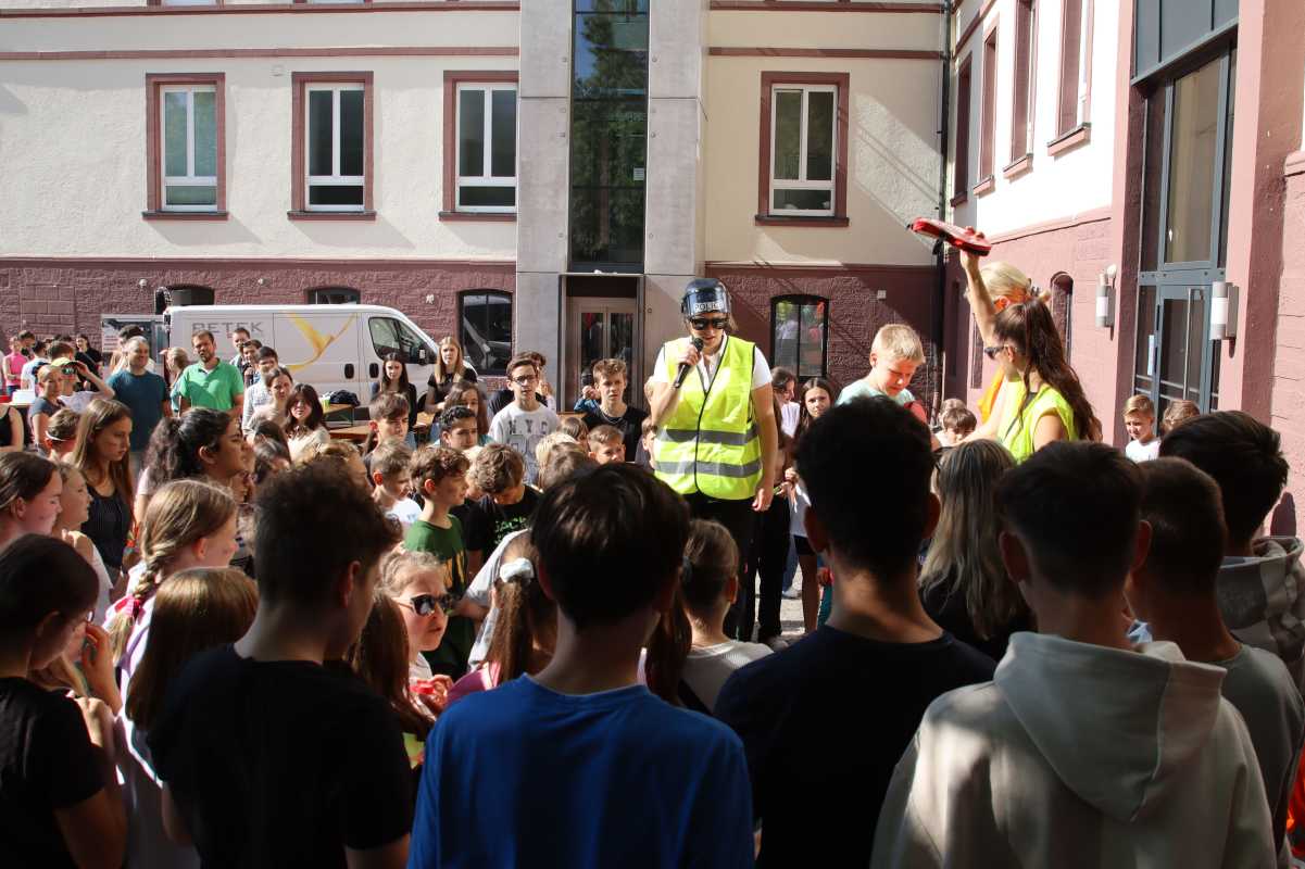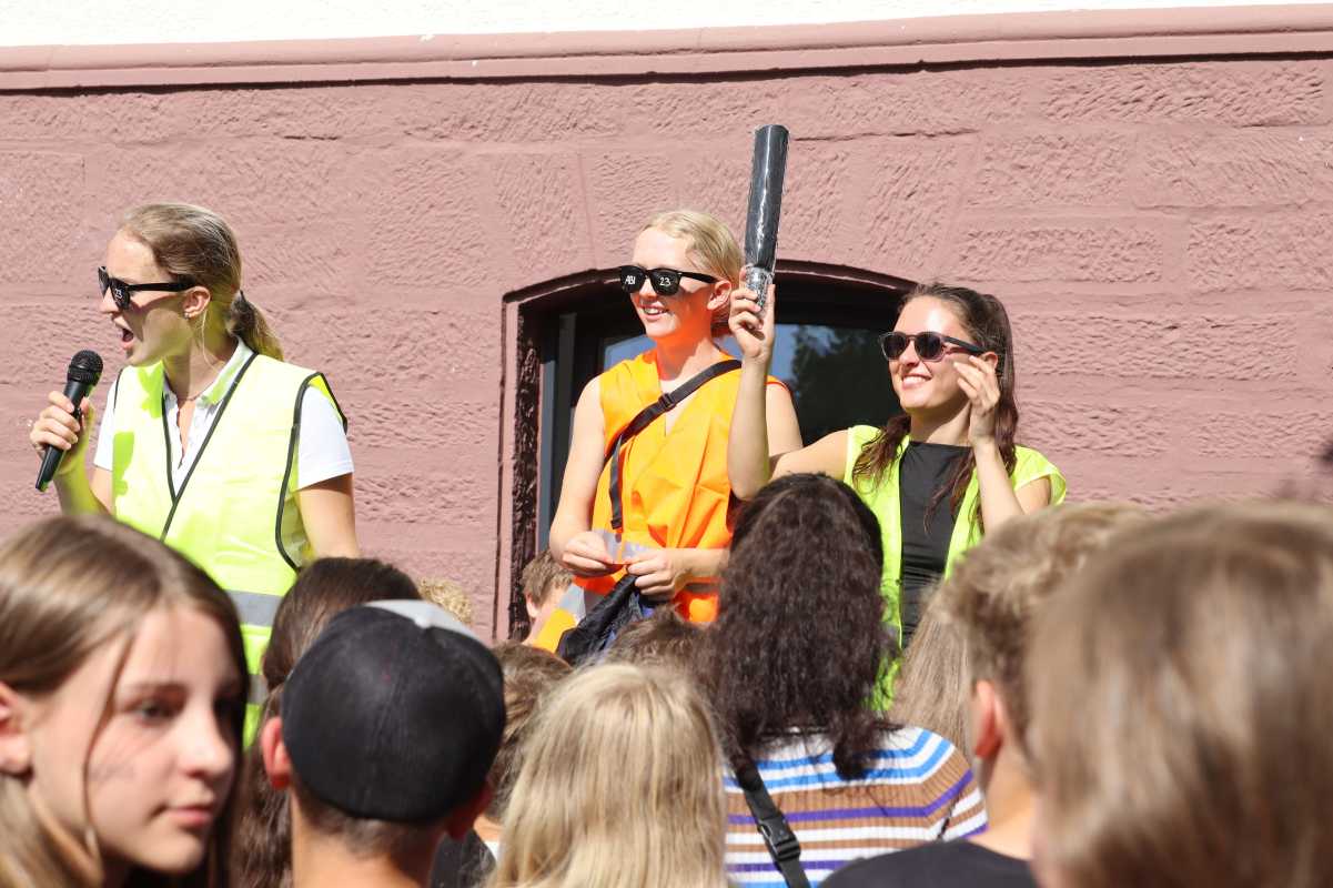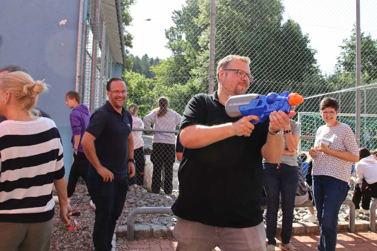 Good cop, bad cop – alles eine Frage der Perspektive. Beim diesjährigen Abistreich hatten sich die Absolventen als Polizisten verkleidet, die als erste Amtshandlung mit Wasserpistolen bewaffnet die Lehrer „verhafteten“. Sie durften sich einen Anwalt suchen und mussten auf dem Schulhof bei ihrer „Verhandlung“ fachbezogene Fragen beantworten, etwa nach der Höhe der Freiheitsstatue, Rechenaufgaben lösen oder sich sportlich betätigen.