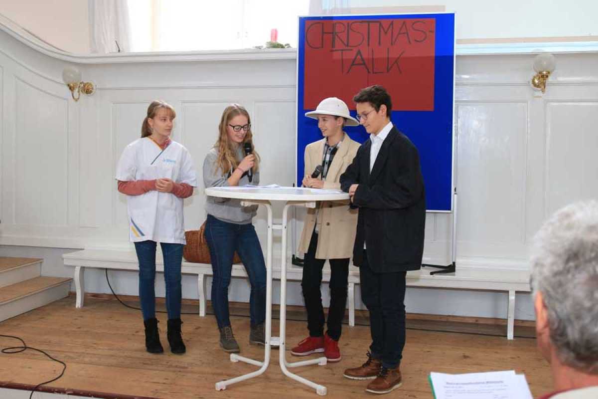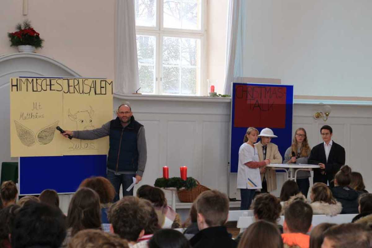 Die Schülerinnen und Schüler der Mittelstufe hatten sich ein Anspiel ausgedacht, bei dem in einer Talkshow eine Ärztin, ein Archäologe und ein Astronom zu Wort kamen, unter anderem um den Stern von Bethlehem und die jungfräuliche Geburt zu diskutieren. Daneben gab es auch eine „Live-Schalte“ ins „himmlische Jerusalem“, während welcher der Religionslehrer Br. Färber die Evangelisten Lukas und Matthäus befragte.