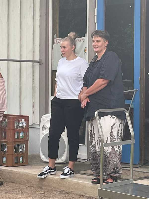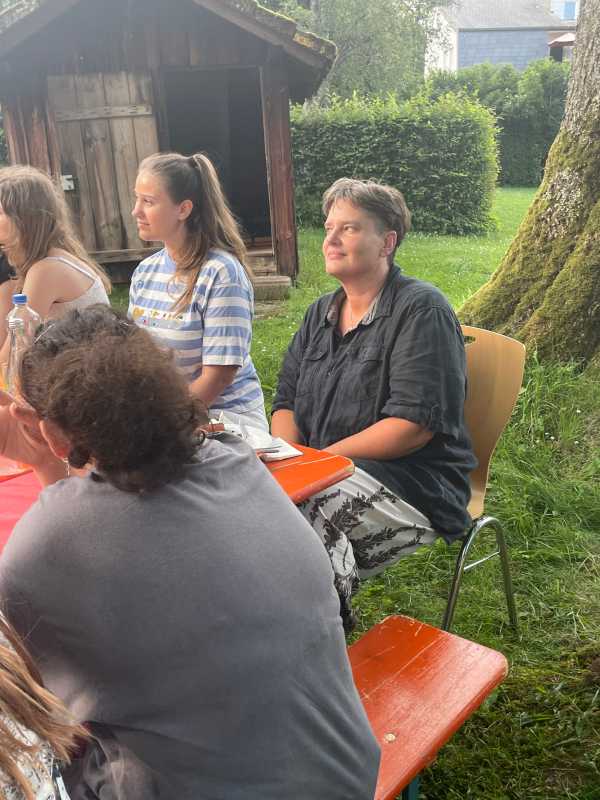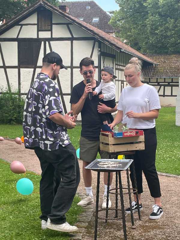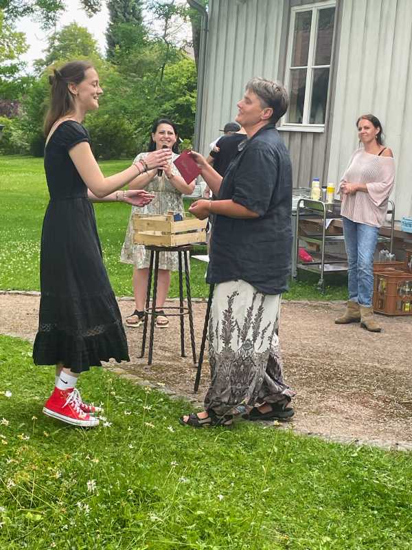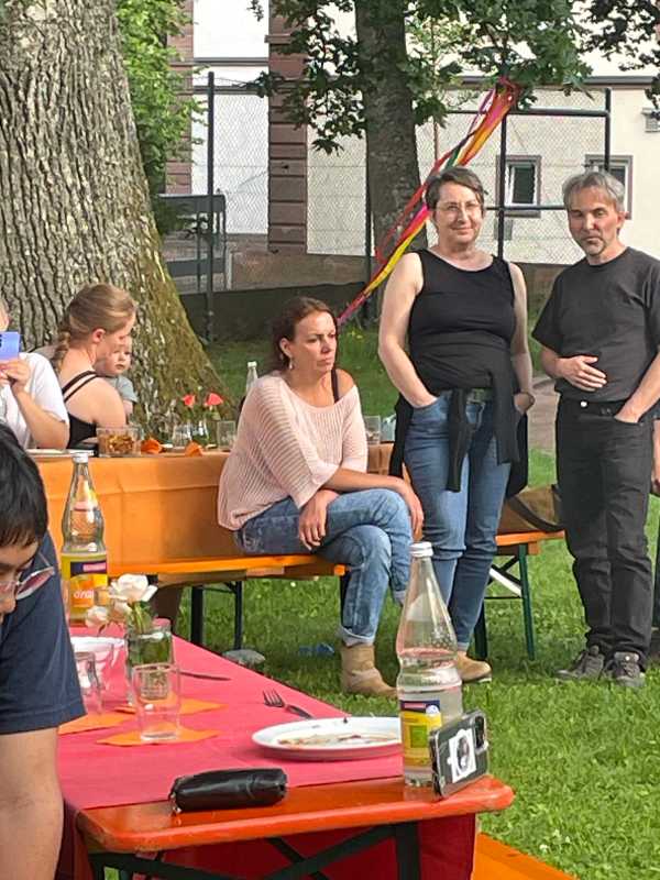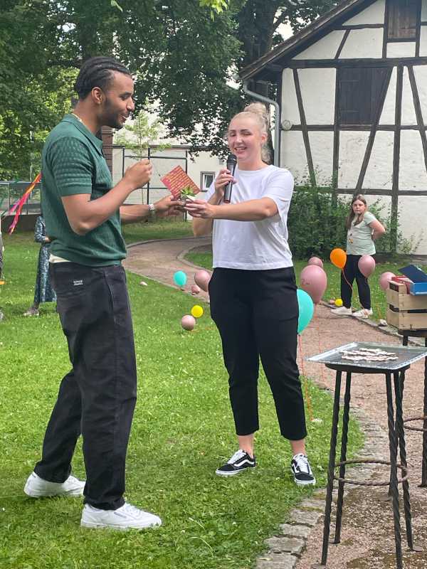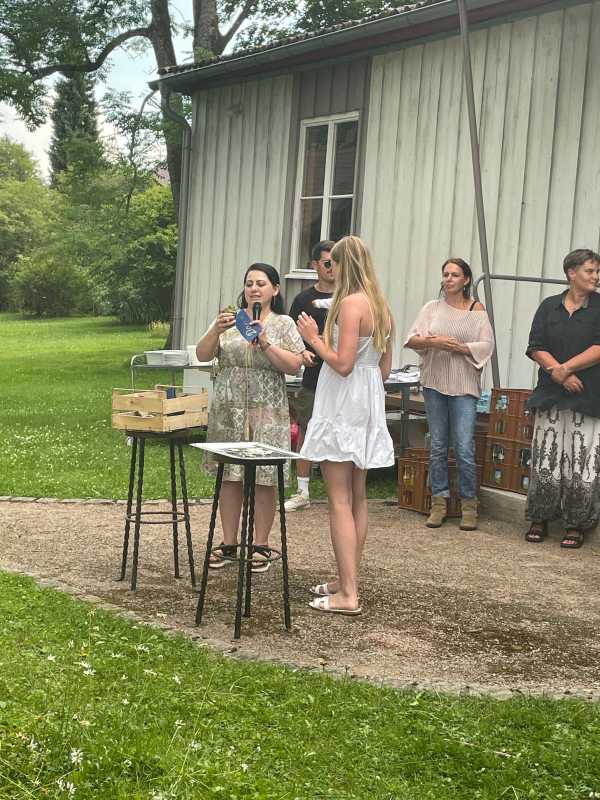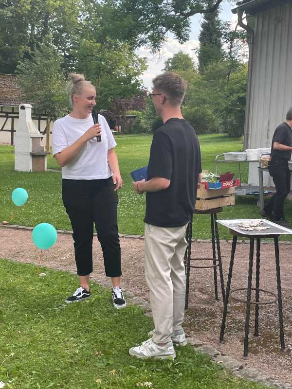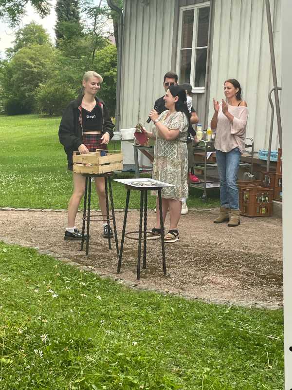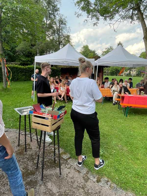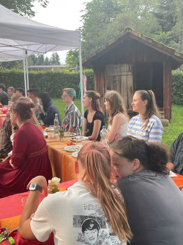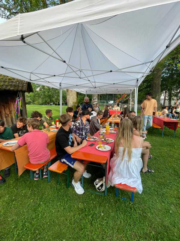 Der Park hinter dem Haus Früauf war liebevoll geschmückt, Tischdecken auf den Bierbänken, Luftballons und bunte Windspiele schufen eine schöne Atmosphäre. Die Schüler*innen und ihre Erzieherinnen und Erzieher genossen einen gemeinsamen Abend voller Erinnerungen und Freude.