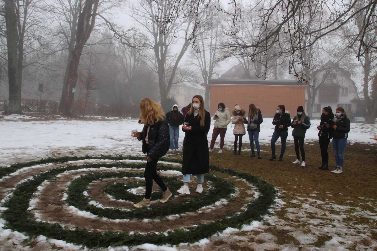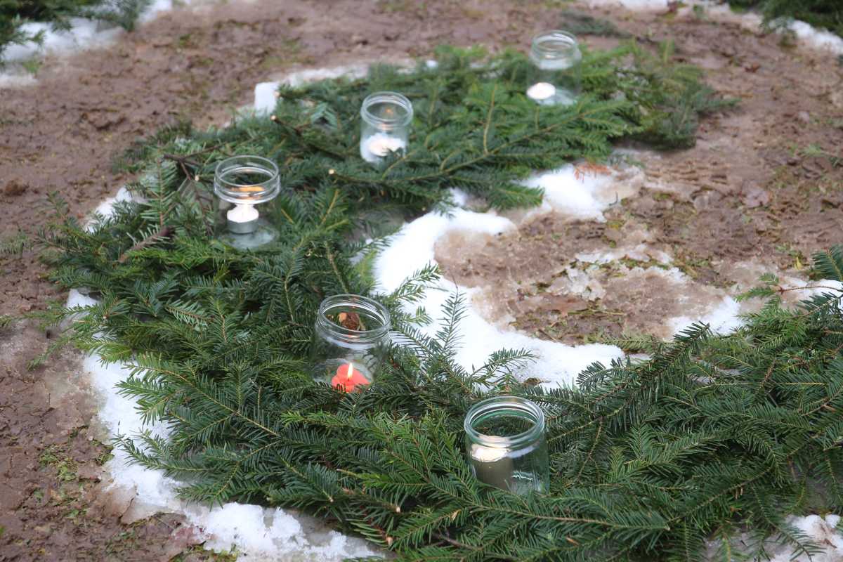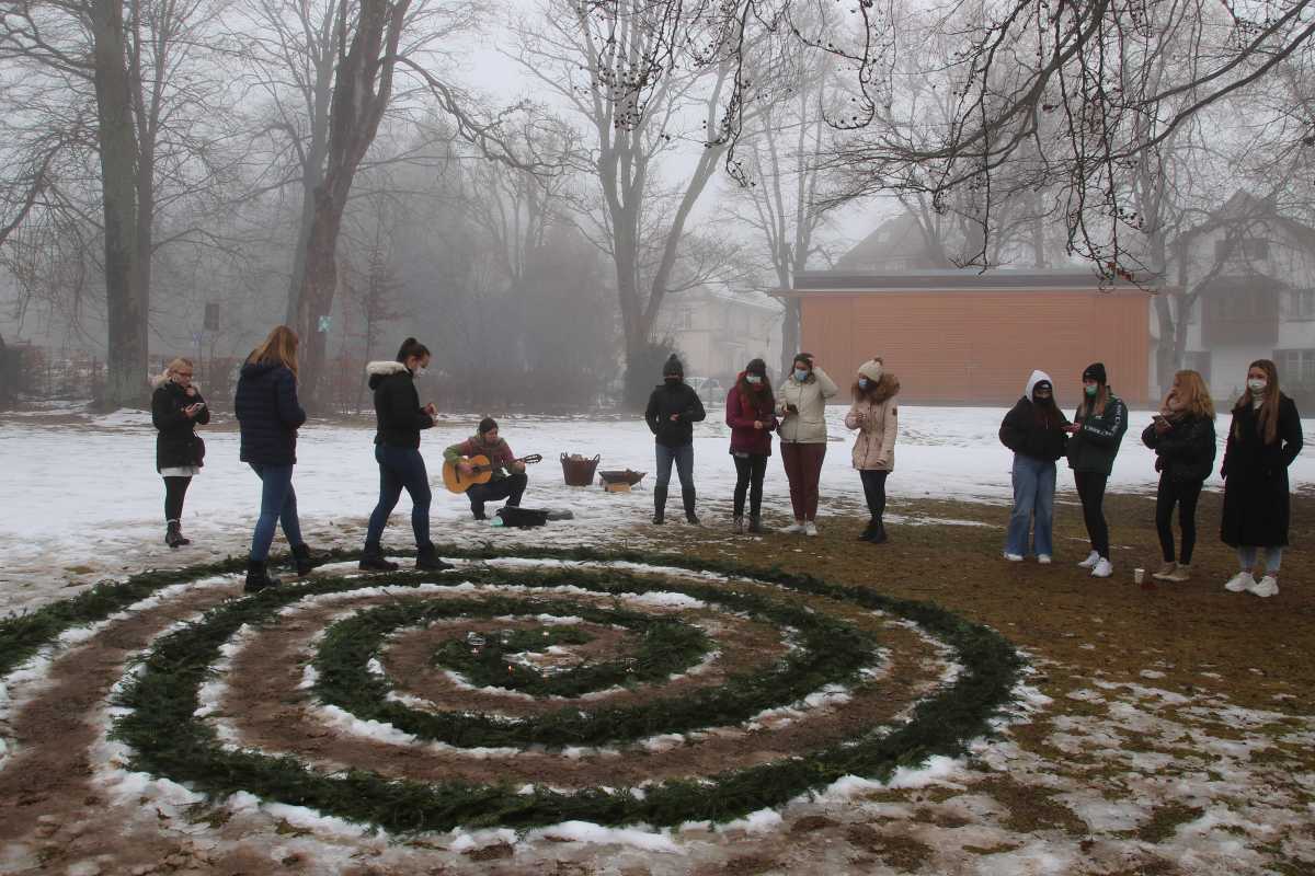 Die angehenden Erzieherinnen hatten zuvor aus Tannenzweigen eine Spirale im Gras ausgelegt, welche sie zu zweit bis ins Innere abschritten. „Das ist ein Ritual aus der Waldorfpädagogik“, erklärte Sr. Heckenberger. „Damit kommt Ruhe in die Gruppe.“ Während jeweils zwei der Auszubildenden den Weg mit Kerzen in der Hand gingen, die sie auf die Spirale stellten, sangen die anderen dazu Weihnachtslieder.