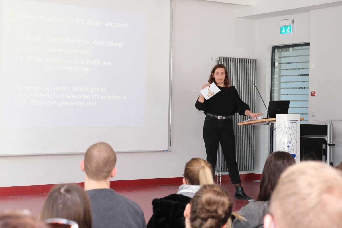 Sie schilderte die politische Situation im Baskenland und ihre Arbeit mit den Kindern, die sie manchmal vor ungeahnte Probleme stellt: „Es ist nicht einfach, Kindern, die nie in ihrem Leben Schnee gesehen haben, zu erklären, was ein Schneemann ist.“ Ihren Mitschülern gab sie wertvolle Tipps, was den Spracherwerb, die Wohnungssuche und die kulturellen Unterschiede angeht, aber auch zu alltäglichen Dingen wie Einkauf oder öffentliche Verkehrsmittel.