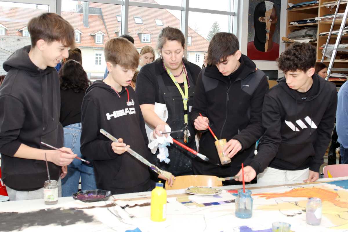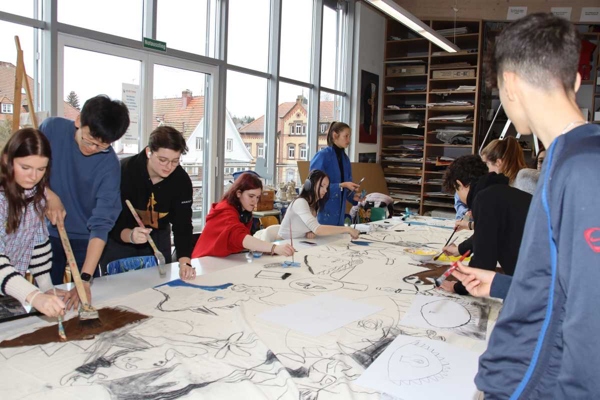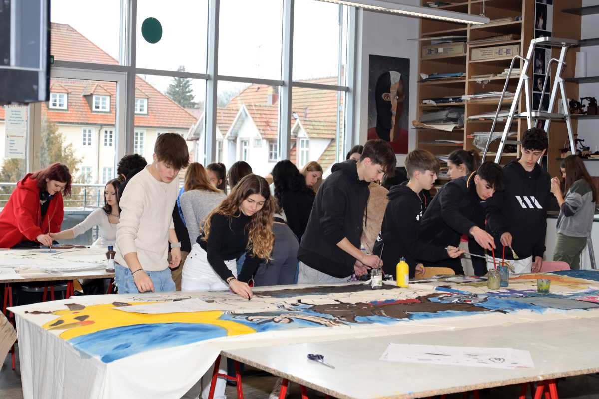 Neben Wanderungen durchs Glasbachtal, einem Ausflug nach Konstanz und einer Fahrt ins Stuttgarter Mercedes-Benz-Museum gehörte ein gemeinsames Kunstprojekt zu den Höhepunkten des Besuchs. Die Zinzendorfschüler*innen und ihre Gäste vom Col·legi Diosesà Sagrada Familia haben auf einem 10 x 1,40 großen Nesseltuch Szenen gemalt, die von Pablo Picassos Bild Guernica inspiriert wurden. “Einerseits ist es ein spanischer Künstler, andererseits haben die Jugendlichen ein großes Bedürfnis, ihre Emotionen zu transportieren, wofür sich das Gemälde gut eignet”, erklärte Kunstlehrerin Sr. Saurer die Wahl des Projektes. Das Bild soll später an der Außenwand des JHH vom Atelier im zweiten Stock bis nach unten hängen.
