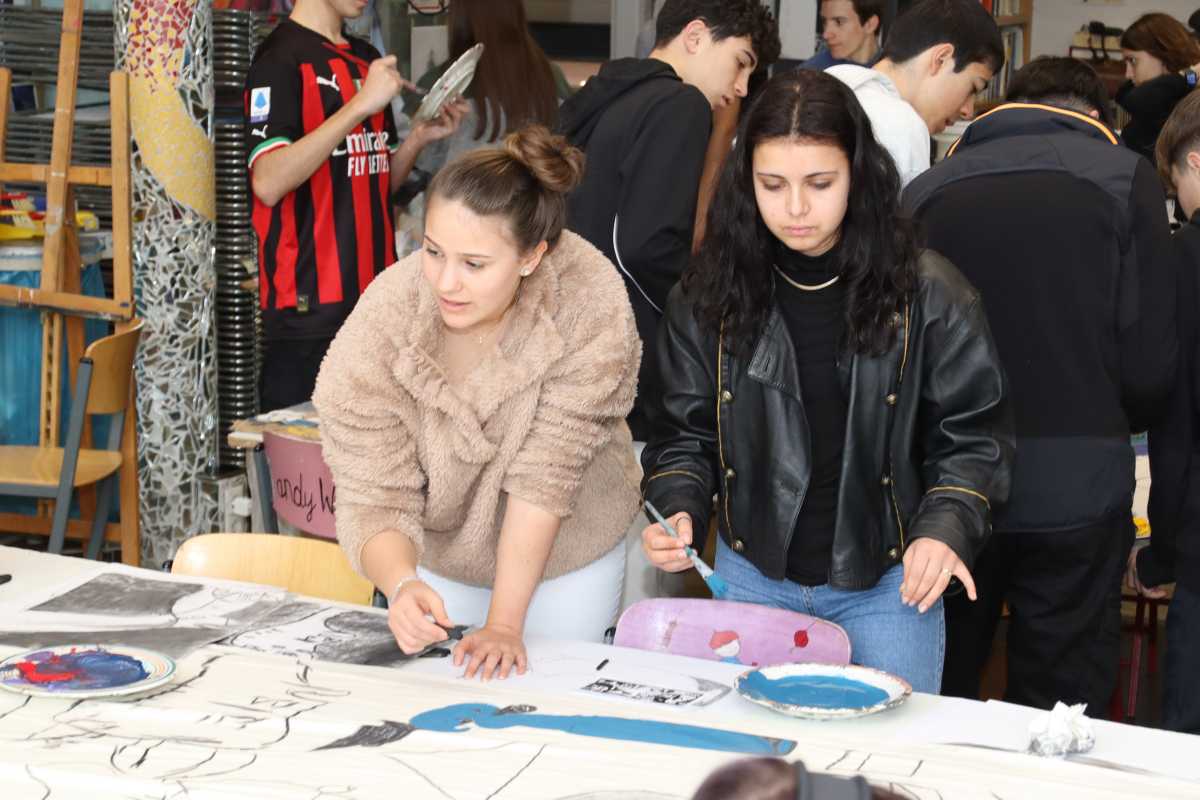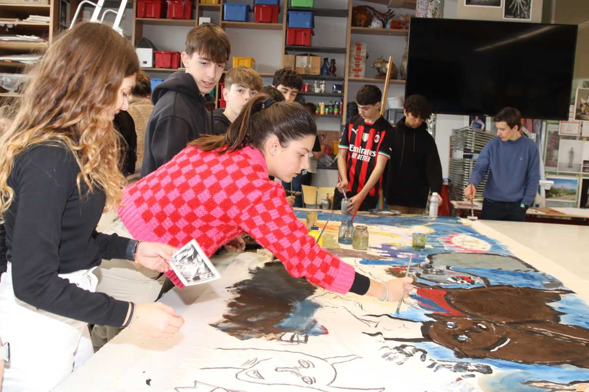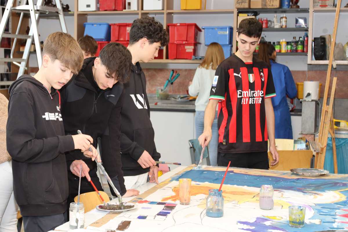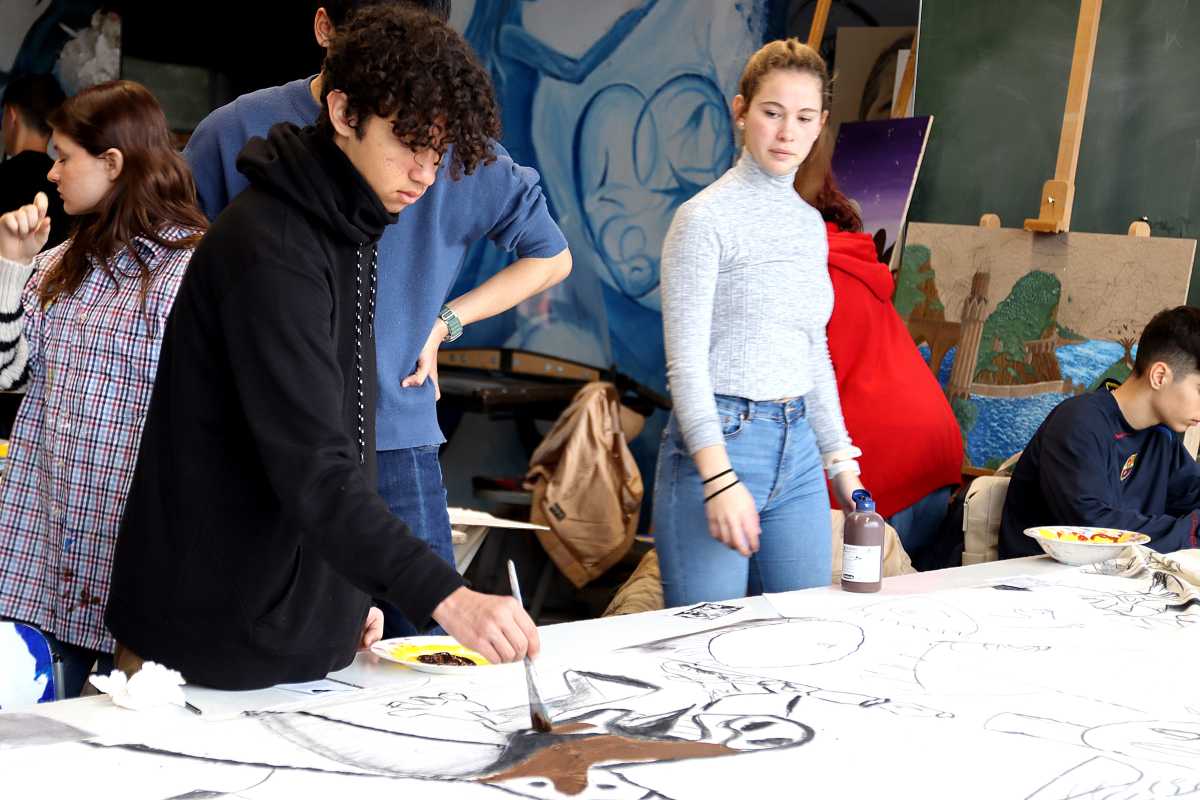 Neben Wanderungen durchs Glasbachtal, einem Ausflug nach Konstanz und einer Fahrt ins Stuttgarter Mercedes-Benz-Museum gehörte ein gemeinsames Kunstprojekt zu den Höhepunkten des Besuchs. Die Zinzendorfschüler*innen und ihre Gäste vom Col·legi Diosesà Sagrada Familia haben auf einem 10 x 1,40 großen Nesseltuch Szenen gemalt, die von Pablo Picassos Bild Guernica inspiriert wurden. “Einerseits ist es ein spanischer Künstler, andererseits haben die Jugendlichen ein großes Bedürfnis, ihre Emotionen zu transportieren, wofür sich das Gemälde gut eignet”, erklärte Kunstlehrerin Sr. Saurer die Wahl des Projektes. Das Bild soll später an der Außenwand des JHH vom Atelier im zweiten Stock bis nach unten hängen.