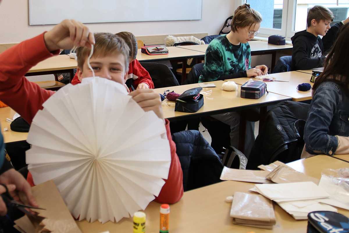 „Außer den Papiertüten, aus denen große Sterne gebastelt werden, haben die Schülerinnen und Schüler alle Materialien aus Restbeständen von zu Hause mitgebracht“, erklärt die Religionslehrerin Sr. Gerspacher, die das Projekt gut im Curriculum unterbringen konnte. „In den achten Klassen ist nämlich Einsatz für andere vorgesehen“. Nicht nur der Erlös der Achtklässler wird für einen guten Zweck gespendet, sondern alles am Stand der Zinzendorfschulen. Neben Selbstgebasteltem gibt es Panettone, Waffeln und heißen Kakao.