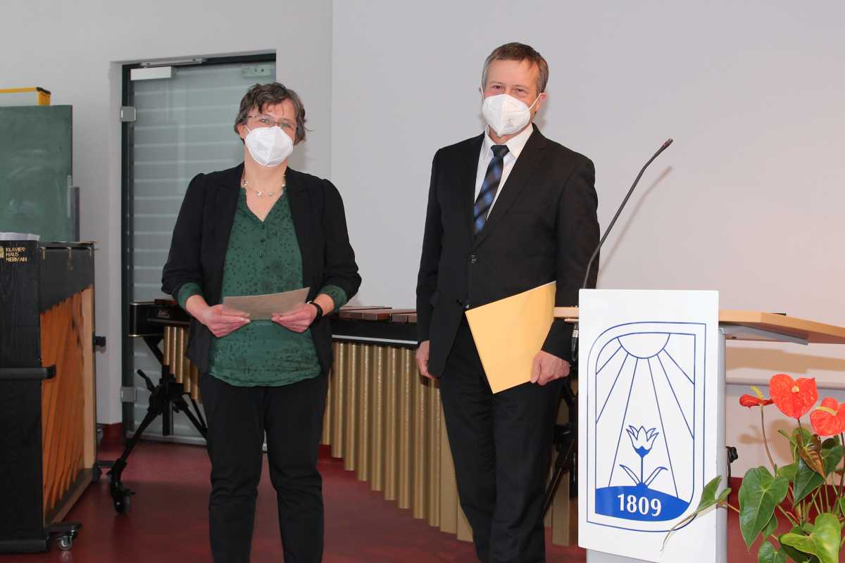 Im pandemiebedingt kleinen, aber feierlichen Rahmen haben die Zinzendorfschulen Sr. Terno als neue Pädagogische Gesamtleiterin begrüßt. Pfarrer Raimund Hertzsch von der Direktion der Herrnhuter Brüdergemeine überreichte ihr die Ernennungsurkunde für die Arbeit in einem „in allen Bereichen wunderbaren Team“, bevor der bis dahin als Kommissarischer Schulleiter agierende Br. Hertnagel im Namen des Schulleitungsteams die pädagogische Leitung der Schule in ihre Hände legte. Das aus den Schul- und Internatsleiter*innen Br. Hertnagel, Sr. Vogt, Br. Sauer, Sr. Schoo-Schemmann, Joachim Jünemann, dem Verwaltungsleiter Br.Banholzer sowie dem Stunden- und Deputatsplaner Br. Schüller bestehende Team hatte ein Jahr lang die Aufgaben der vakanten Stelle übernommen.