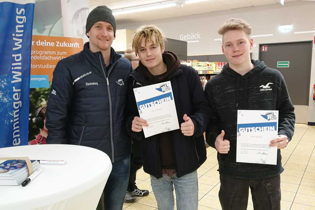 Schließlich gewannen zwei Schüler bei einem Quiz Karten für ein Spiel der Wild Wings. Der Eishockeyspieler Mirco Sacher war an dem Tag in der Filiale und verteilte Autogramme.