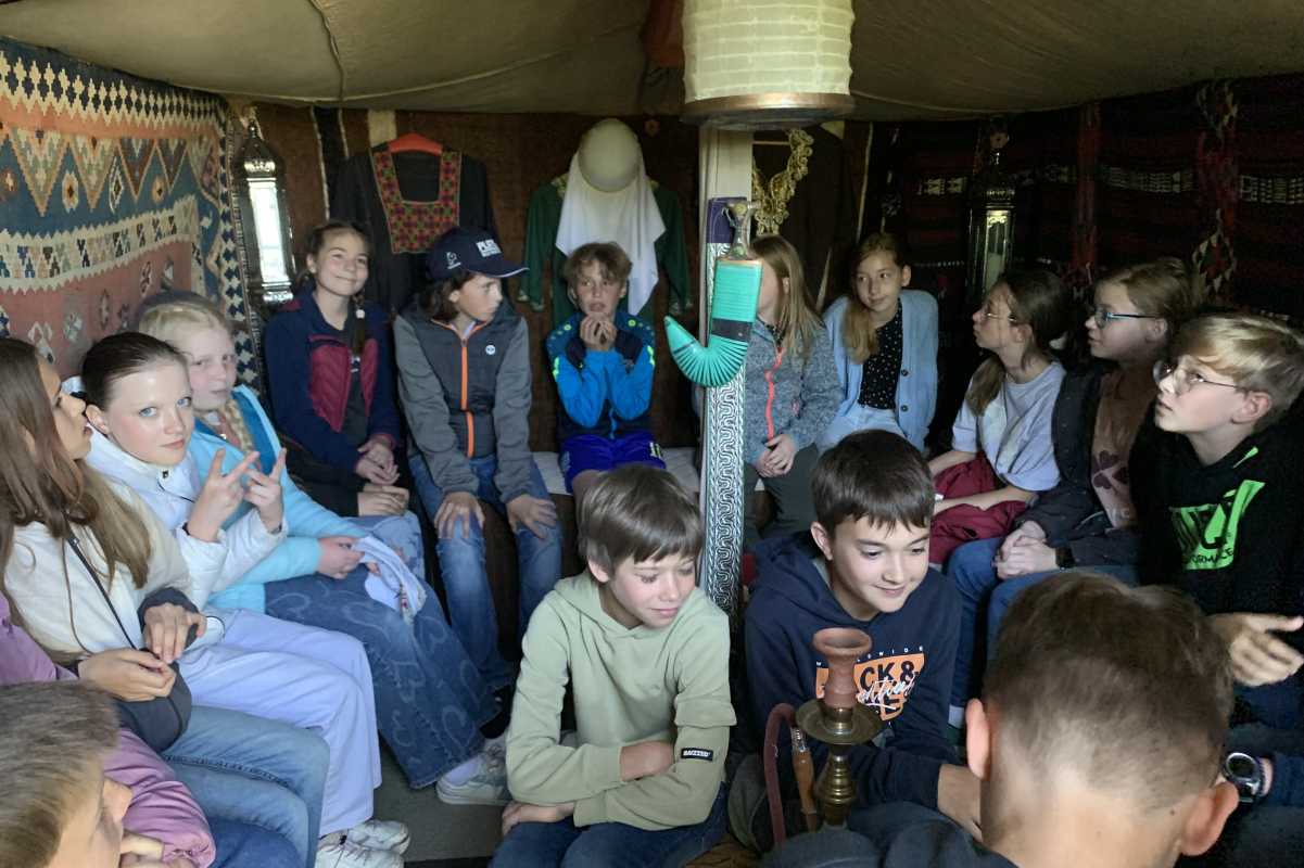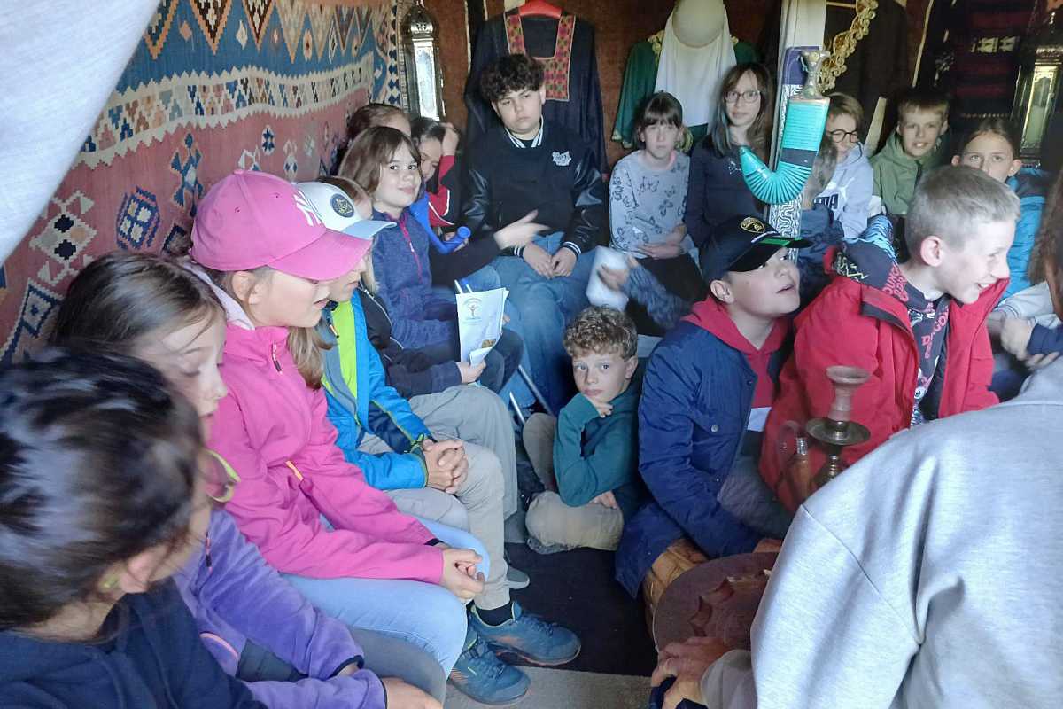 Ein Höhepunkt war die Einladung zur orientalischen Gastfreundschaft: Bei Tee und frischem Hefezopf tauchte die Gruppe in die Atmosphäre des Nahen Ostens ein. Im Zelt Abrahams wurde die Geschichte des Stammvaters in eindrucksvoller Weise erzählt. Musikinstrumente aus der Region durften ausprobiert werden – ein Erlebnis für alle Sinne.