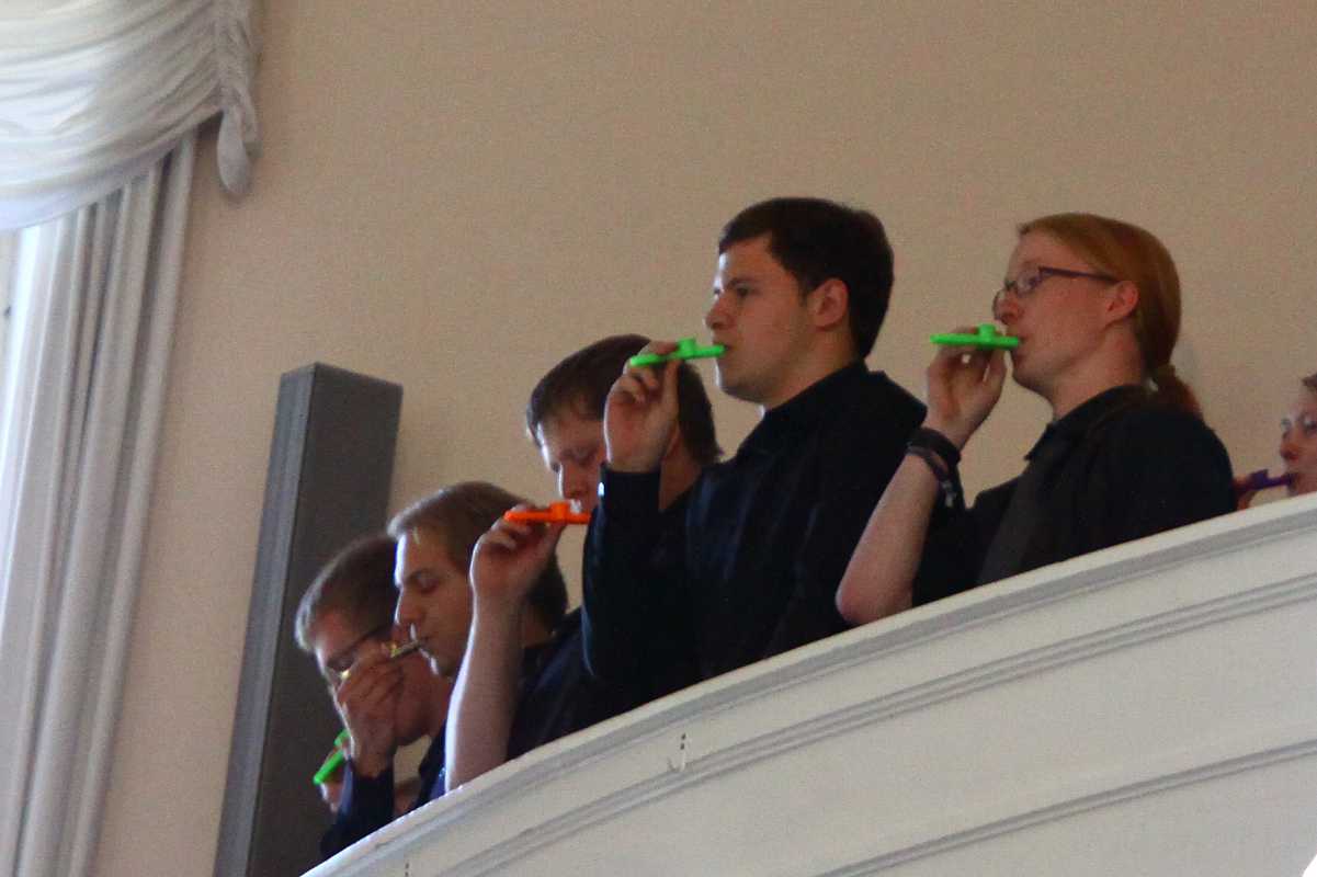 Natürlich ließ das begeisterte Publikum die Musiker nach dem letzten Stück, dem Titelstück aus dem Gershwin-Musical „Strike Up The Band“, nicht ohne Zugabe gehen. Diese wurde von allen beteiligten Musikern gegeben und hatte natürlich auch wieder eine Überraschung parat: Bei John Philip Sousas Militärmarsch „Stars and Stripes Forever“, auch bekannt aus der Werbung für das Putzmittel „Der General“, unterstützten die Chöre das Blasorchester mit Kazoos. „In dieser Version haben Sie es bestimmt noch nie gehört“, vermutete der Dirigent Michel.