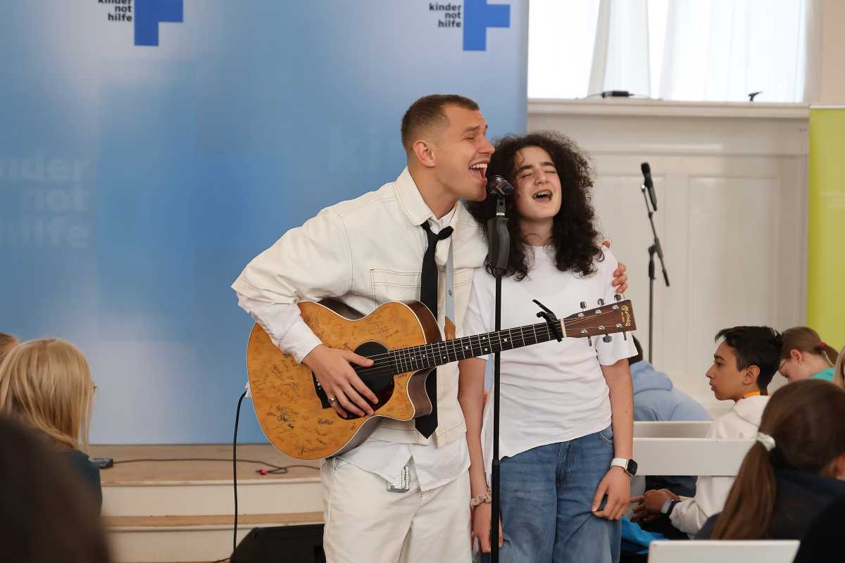 Mal sang er den Refrain im Wechsel mit den Unterstufenschüler*innen, mal holte er Fans auf die Bühne oder stellte sich mitten unter sie, um gemeinsam zu musizieren. Die Sechstklässlerin Lara-Maria durfte sogar mit ihm am Mikrofon stehen und ein Duett singen.