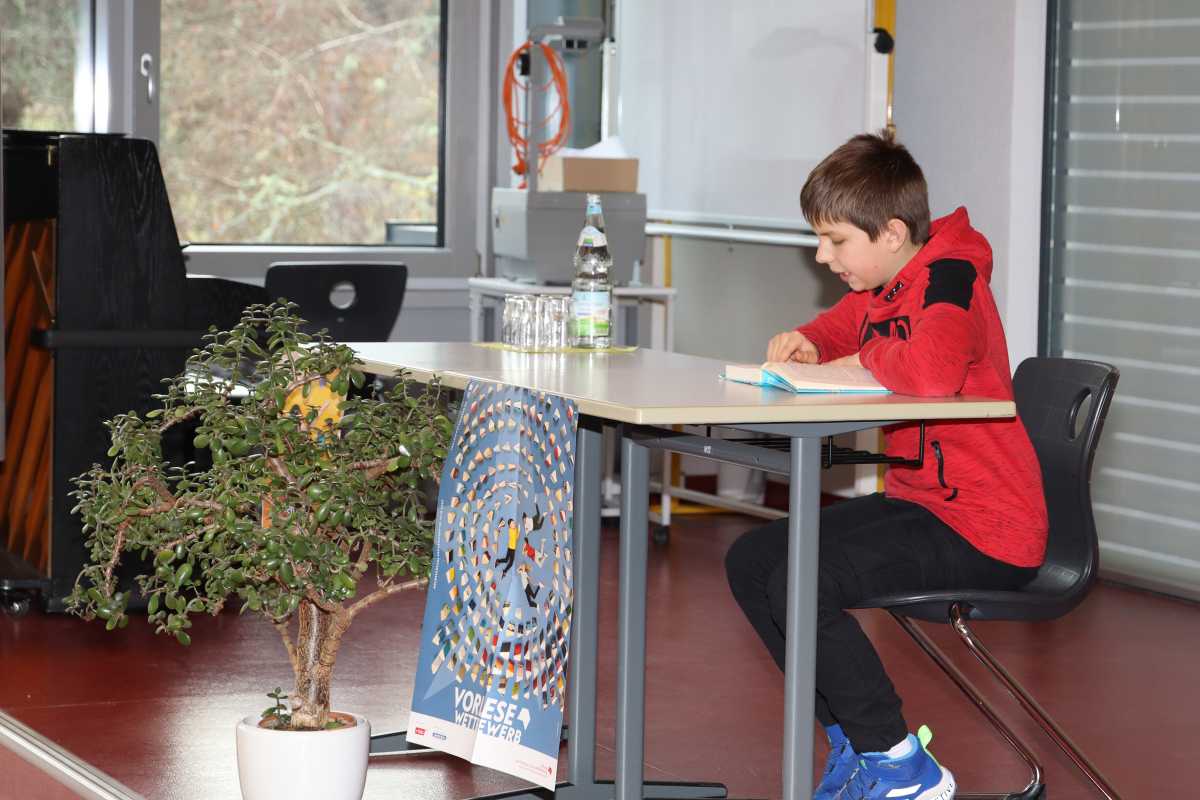 Nach einer kurzen Pause lasen alle aus einem Überraschungstext vor, der in diesem Jahr aus David Walliams „Billionen-Boy“ stammte. In beiden Teilen der Prüfung ging es darum, möglichst flüssig und spannend zu lesen, was alle Klassensieger, die in vergangenen Wochen ermittelt worden waren, großartig meisterten, so dass die Jury, die aus Deutschlehrerinnen und der Vorjahressiegerin bestand, sich lange beraten musste. Am Ende stand fest, dass Eline ihre Texte einen Tick flüssiger als ihrer Mitbewerberinnen und Mitbewerber präsentierte.