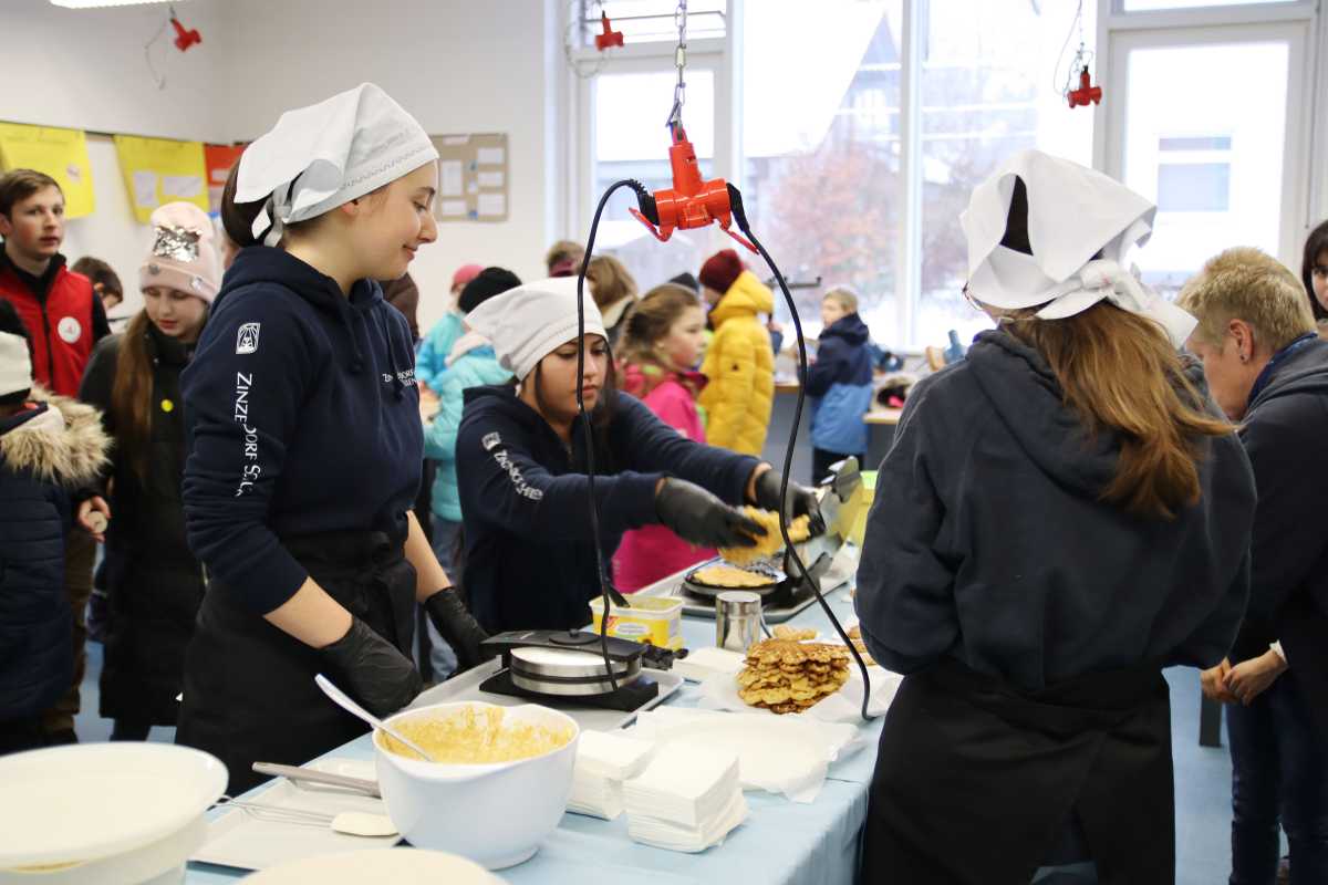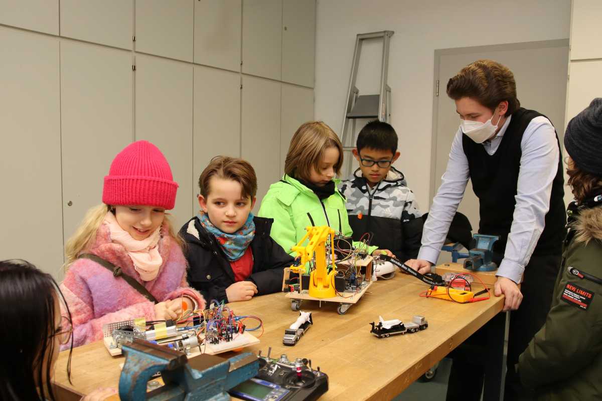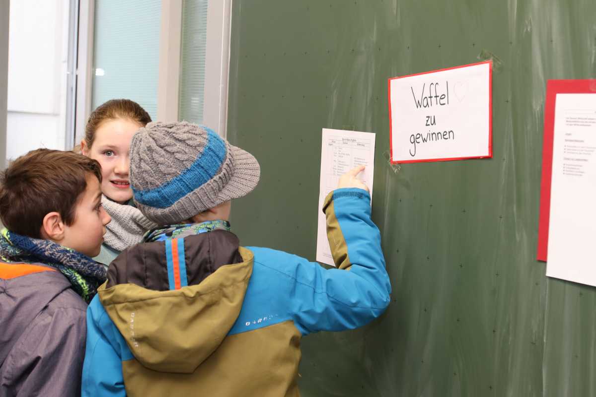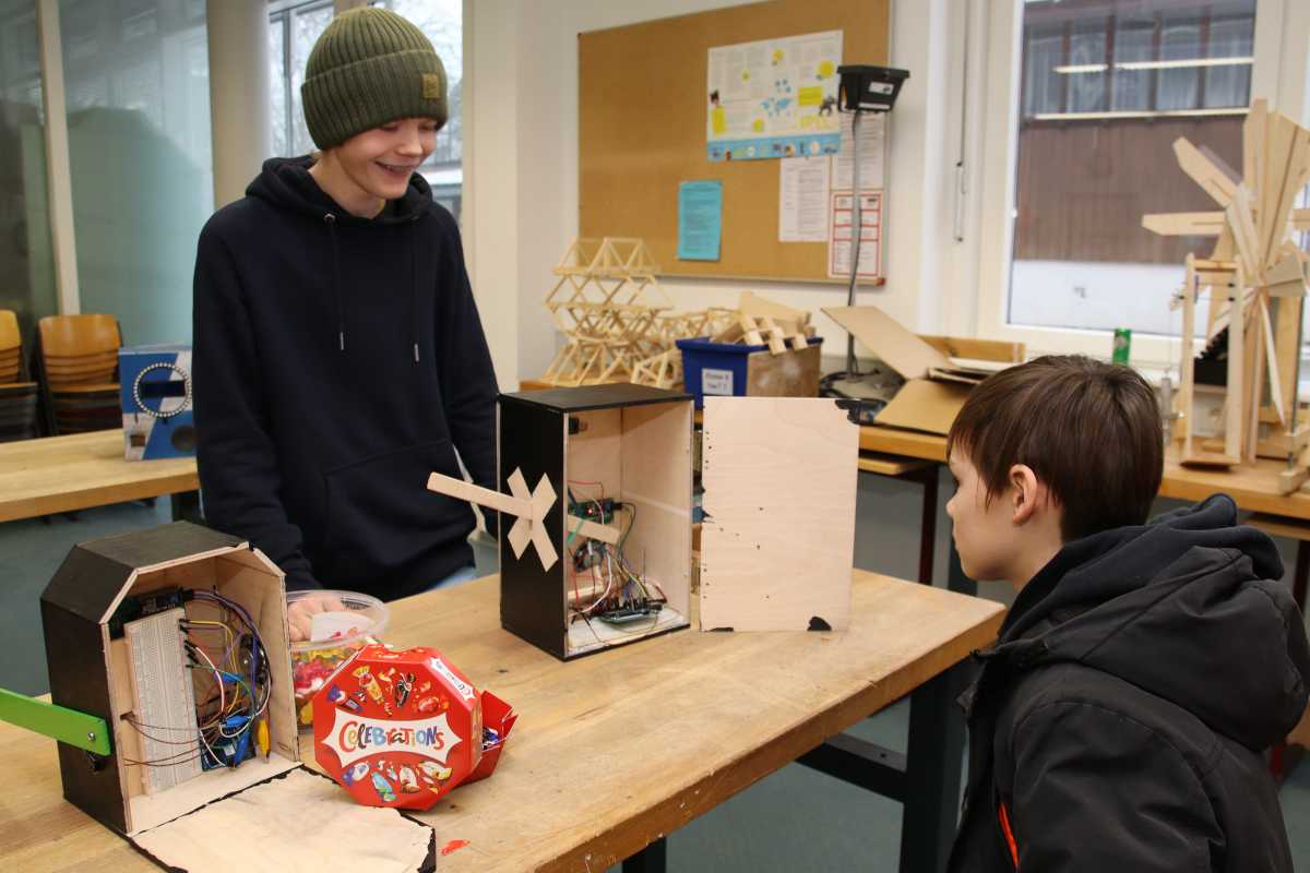 Währenddessen führten die Schülerinnen und Schüler der SMV die Viertklässler durch die Schulgebäude, wo sie über spannende Chemie-Experimente und Kunstwerke staunen konnten. Die neue Sandbox, die mittels Augmented Reality den Erdkundeunterricht anschaulich macht und die technischen Versuche im Fach NWT sorgten ebenfalls für große Augen. Mit einem Quiz, bei dem es Waffeln zu gewinnen gab, stellte sich das Fach AES vor und in der Turnhalle durften sich alle beim Spiel ohne Grenzen austoben. Zwischendurch gab es immer wieder kleine Stärkungen wie Kuchen, Muffins und selbstgebackene Steinofen-Pizza der Back-AG.