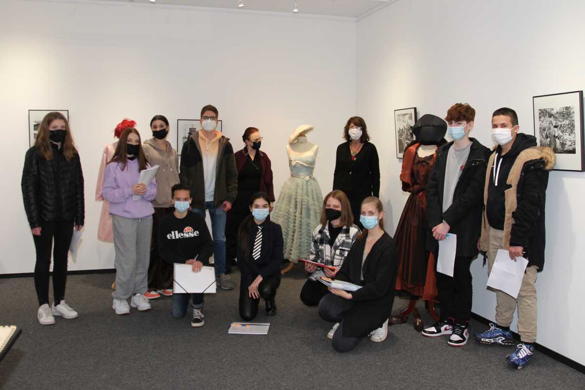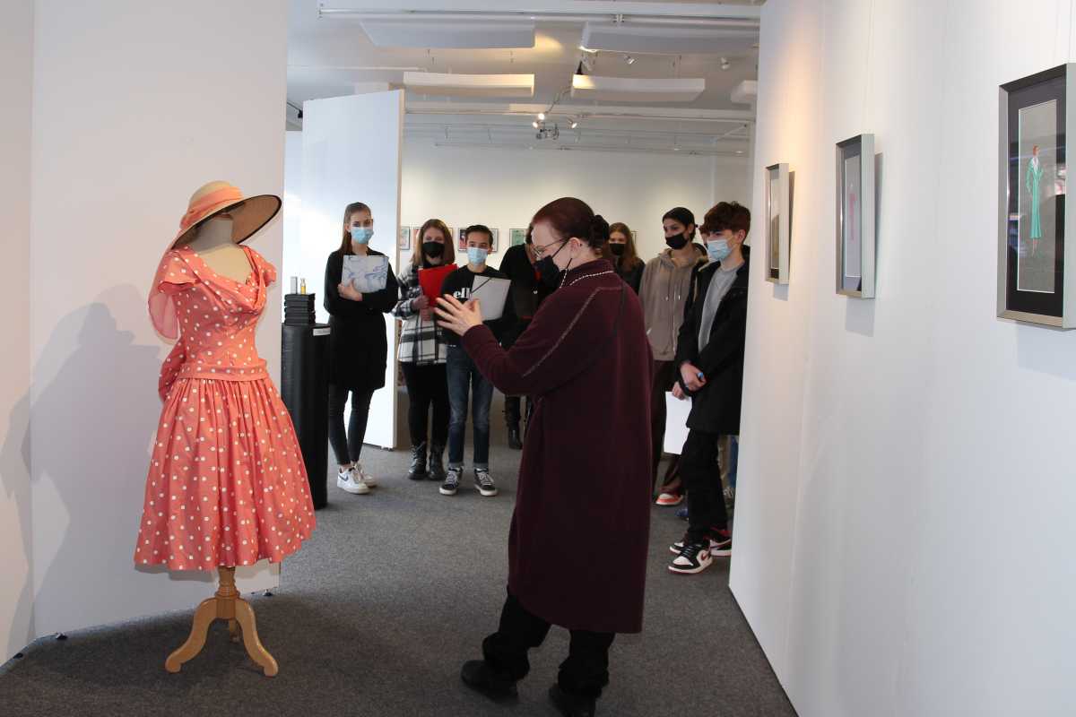 Im Vorfeld hatten sich die Schüler*innen die verschiedenen Aspekte und Funktionen von Bekleidungsstoffen erarbeitet. In die Ausstellung sind sie dann mit konkreten Fragestellungen gegangen. So sollten sie sich ein Lieblingsmodell aussuchen und sich Gedanken über die Zusammenstellung, Muster, Farben, Epochen und Anlässe machen. „Es ist spannend, die verschiedenen Modeepochen zum Beispiel auch mit der Architektur, Möbeln oder Musik zu verbinden“, erklärte Sr. Helms. „Hier können die Schüler*innen erleben, wie Mode unseren Alltag beeinflusst.“