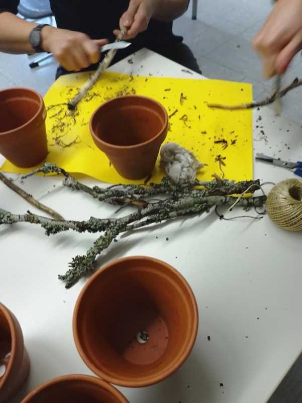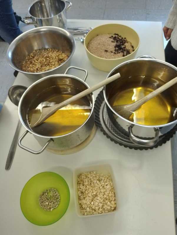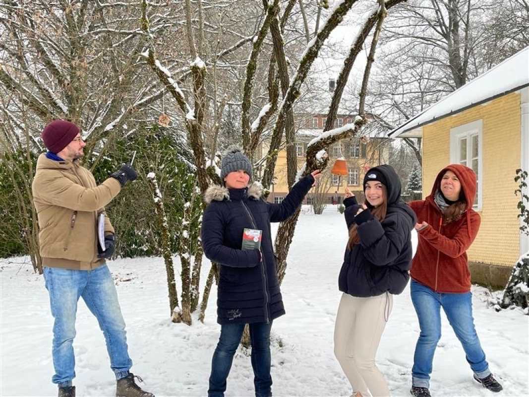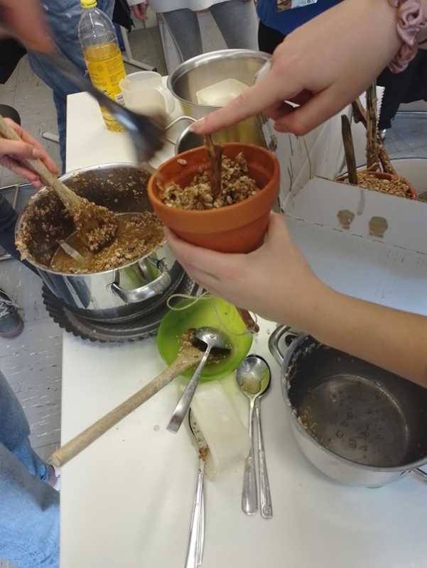 Damit es den Tieren gut schmeckt, hatten die Auszubildenden Pflanzenfett mit Nüssen, Wildfrüchten und Samen vermengt und die Masse in allen möglichen Förmchen wie Tontöpfen, Muffinformen, Plätzchenausstecher, ausgehöhlte Äpfel und alte Tassen verteilt. Die angehenden Erzieher*innen arbeiteten dabei zumeist in kleinen Gruppen, in denen einige die Zutaten abwogen, andere das Fett erhitzten und wieder andere die Masse abfüllten. Die Leckereien mussten dann nur noch aushärten, bevor sie im EDH-Garten verteilt werden konnten. „Das war eine schöne Erfahrung“, waren sich die Schülerinnen einig.