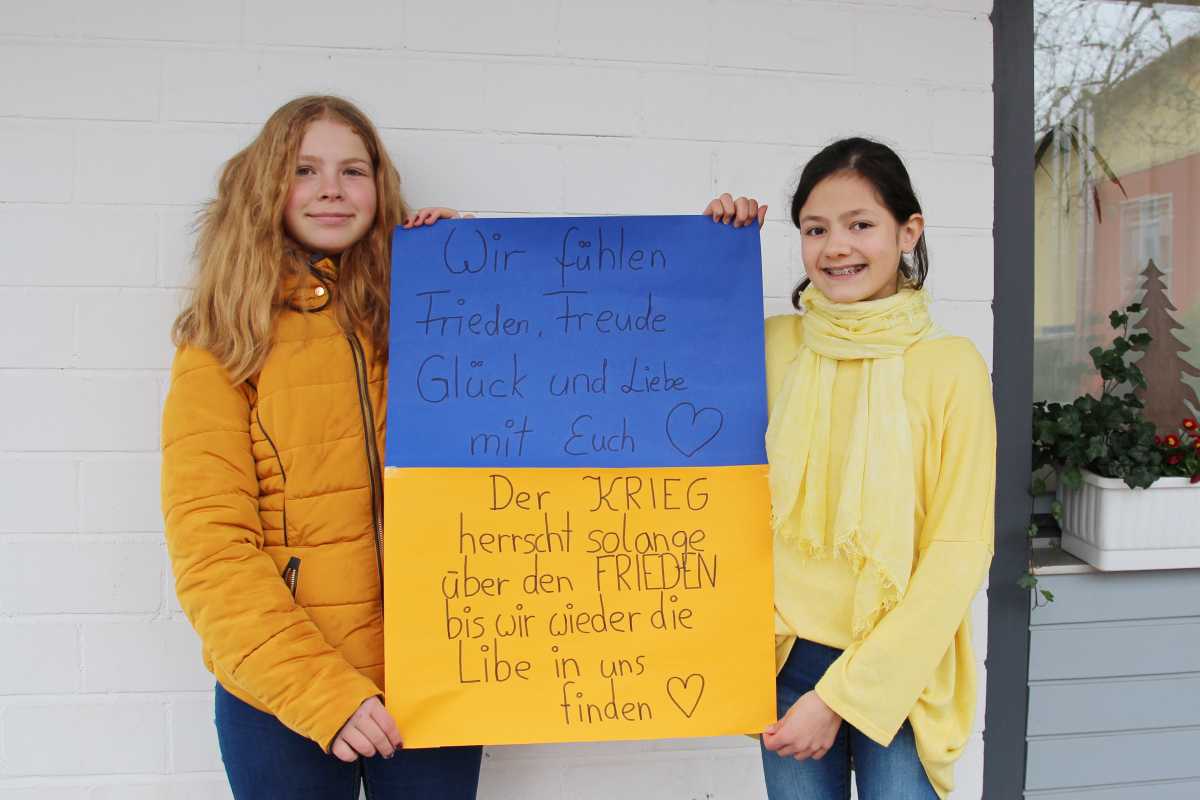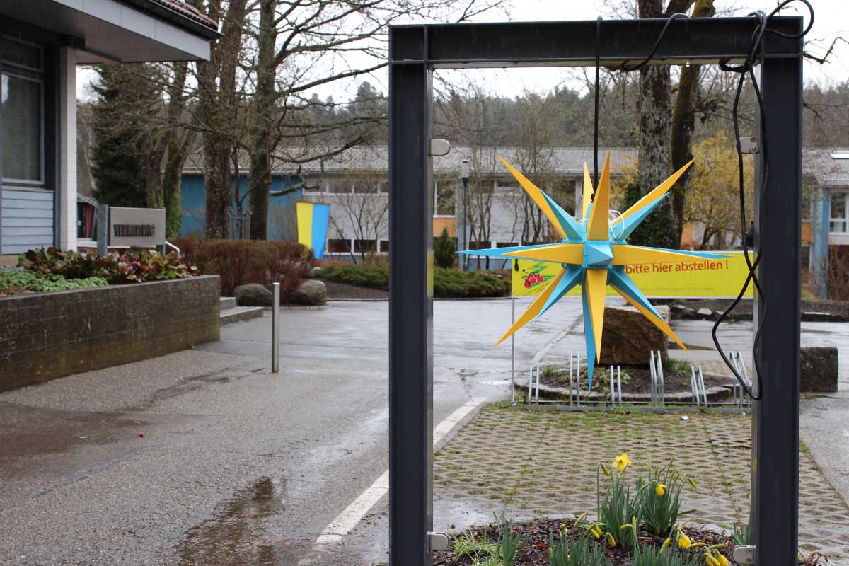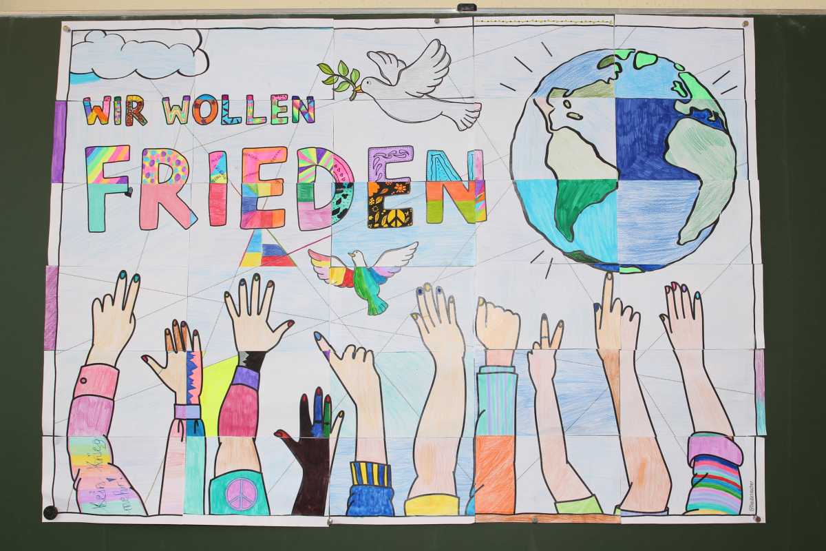 Die 6b hat ein riesiges Plakat hergestellt, das fast wie ein Puzzle aus verschiedenen Teilen besteht, von denen jede*r ein Teil ausgemalt hat. Die 9R hat aus je zwei blauen und gelben Herrnhuter Sternen zwei große Sterne in den Farben der Ukraine zusammengestellt. Viele Klassen sind hier nicht erwähnt, waren aber trotzdem eifrig bei der Sache. Sie alle eint vor allem ein Wunsch: der nach Frieden.