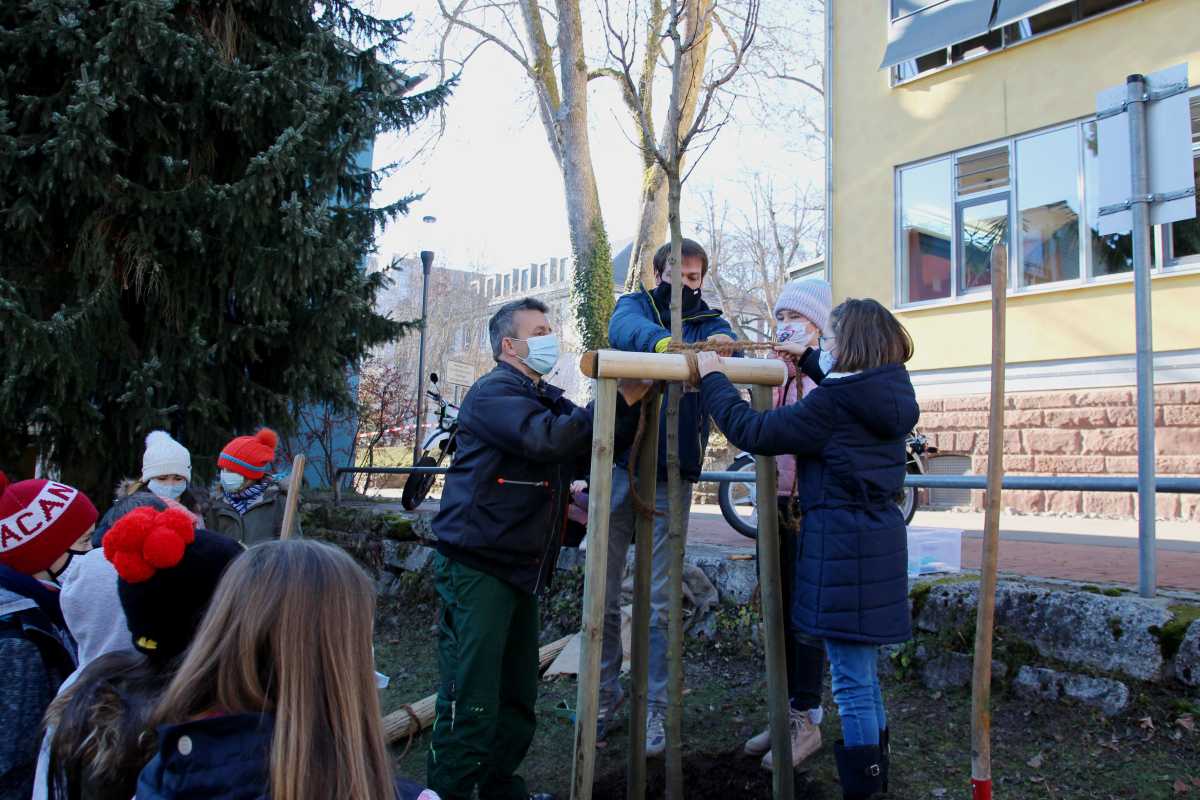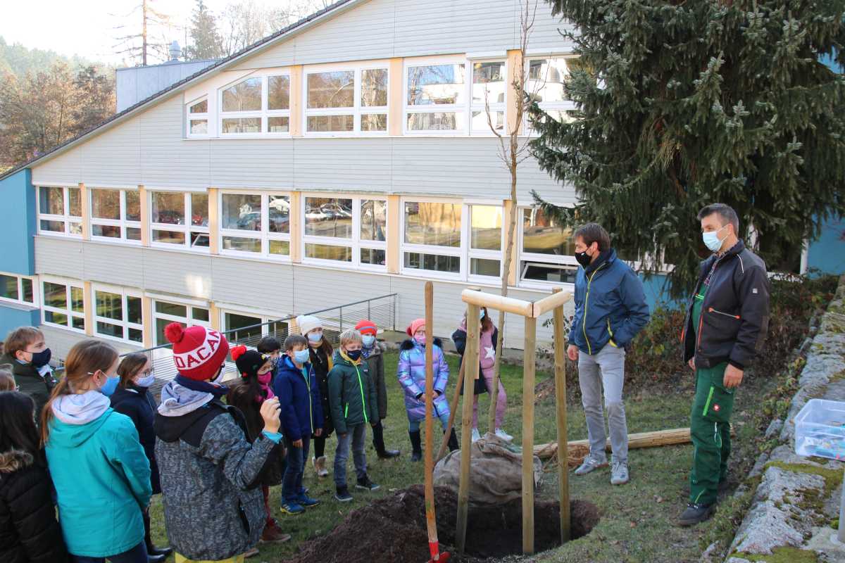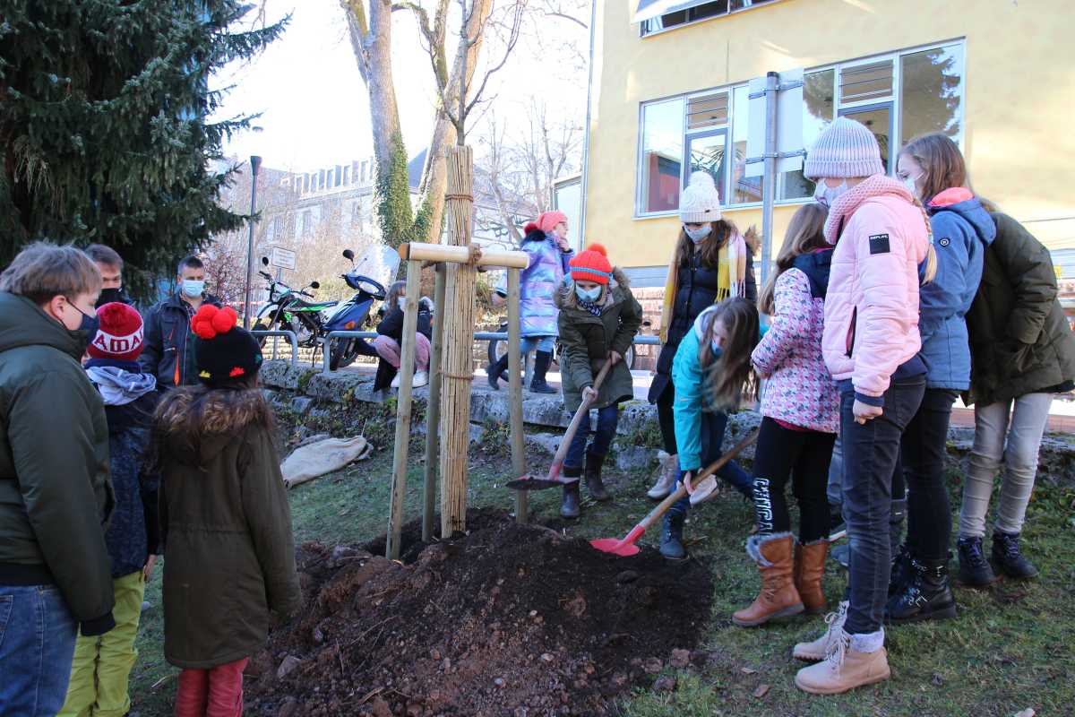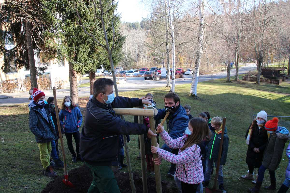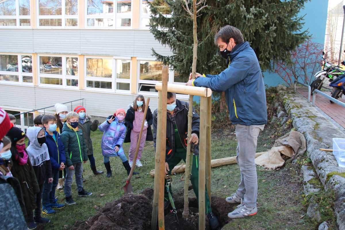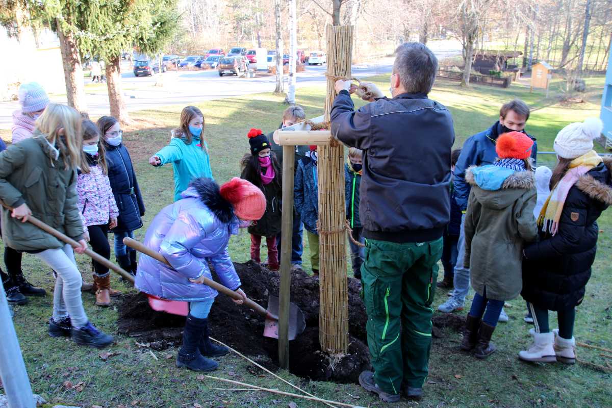 Bei der Aktion durften die Kinder nicht nur zusehen, sondern selbst mit Hand anlegen und bekamen erklärt, worauf es beim Pflanzen eines Baumes ankommt. Neben dem richtigen Zeitpunkt und der Dreibeinstütze, die nicht nur den Baum gerade, sondern auch den Rasenmäher fern hält, ist besonders der Schutz der Rinde wichtig. Der hellgraue Stamm wurde mit einer Schilfrohrmatte umwickelt, damit er nicht unter den winterlichen Temperaturschwankungen an der Südseite leidet. „Die Rinde würde sonst aufplatzen“, so der Fachmann.
