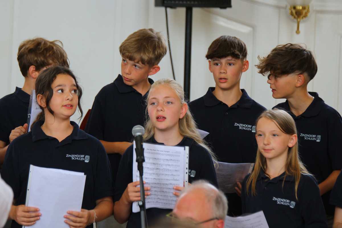 Nach einer jazzig angehauchten Version von Elton Johns „Your Song“, bei der die Sechstklässlerin Lara Rau als Solotrompeterin begeisterte, machten die Bläser die Bühne frei für den Chor der 5. Klassen. Die jüngsten Zinzendorfschülerinnen und -schüler bewegten sich souverän durch ein Repertoire, das vom englischen Folksong Lavender's Blue aus dem 17. Jahrhundert über Johannes Michels Vertonung eines Heinz-Erhard-Textes bis hin zu Albert Hammonds "Give a Little Love" reichte.