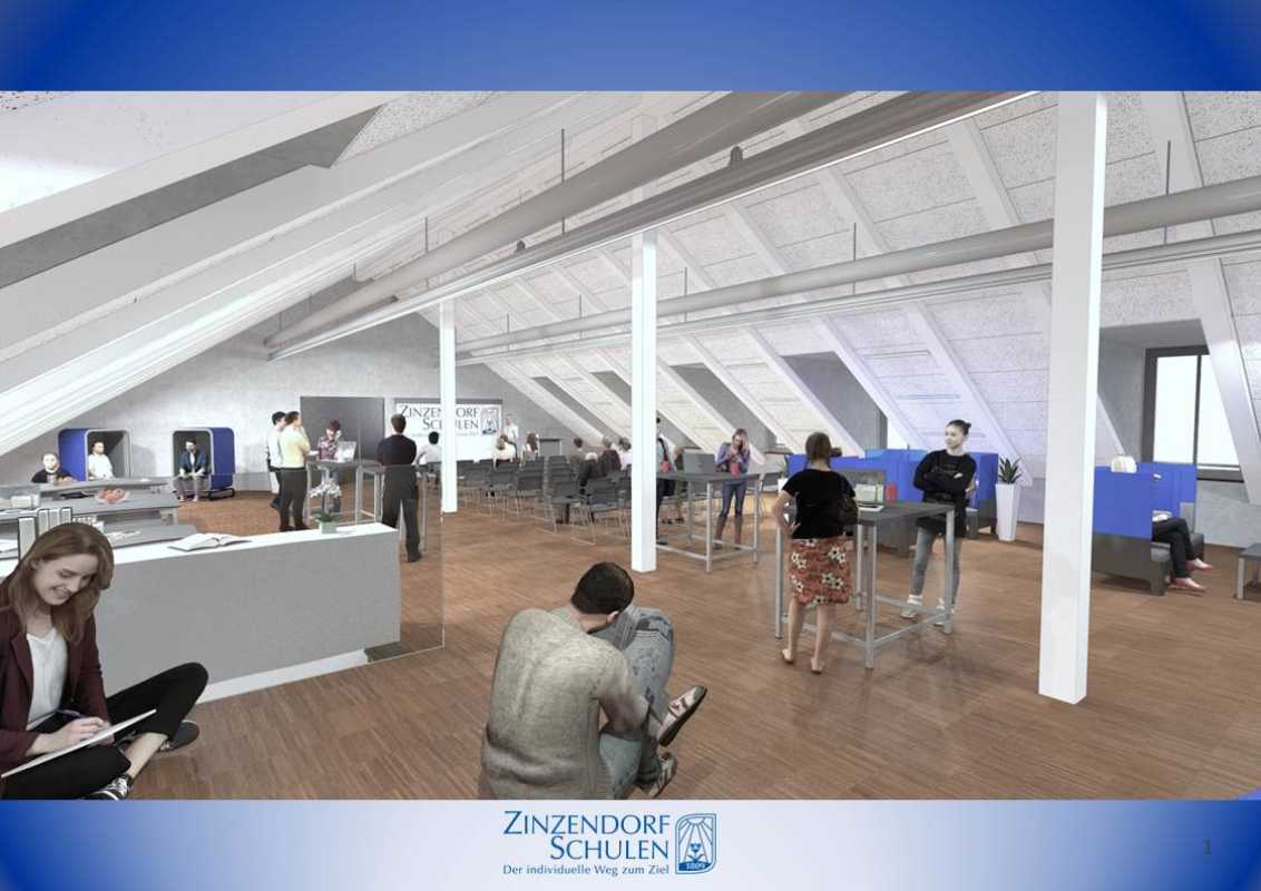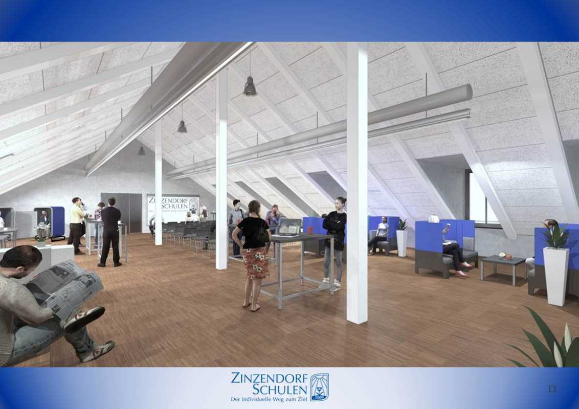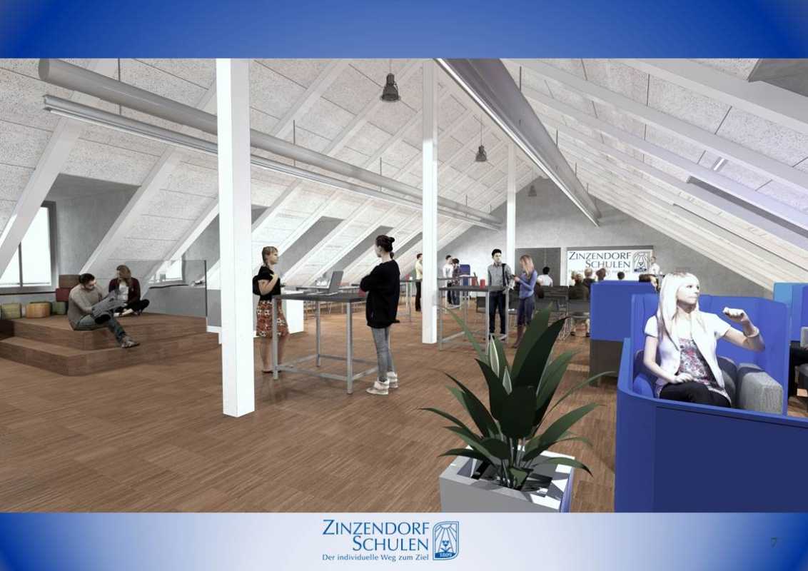 Entsprechend dem digitalen Konzept der Zinzendorfschulen wird das gesamte Dachgeschoss mit WLAN ausgestattet, um die Arbeit mit Tablets zu ermöglichen. Damit unter dem Dach niemand den Kopf einziehen muss, wird dieses um teilweise bis zu 1,40 Meter angehoben, zwei Loggien bringen zudem Licht in das Stockwerk. Für dieses Vorhaben wird der gesamte alte Dachstuhl abgetragen und anschließend der neue aufgesetzt.