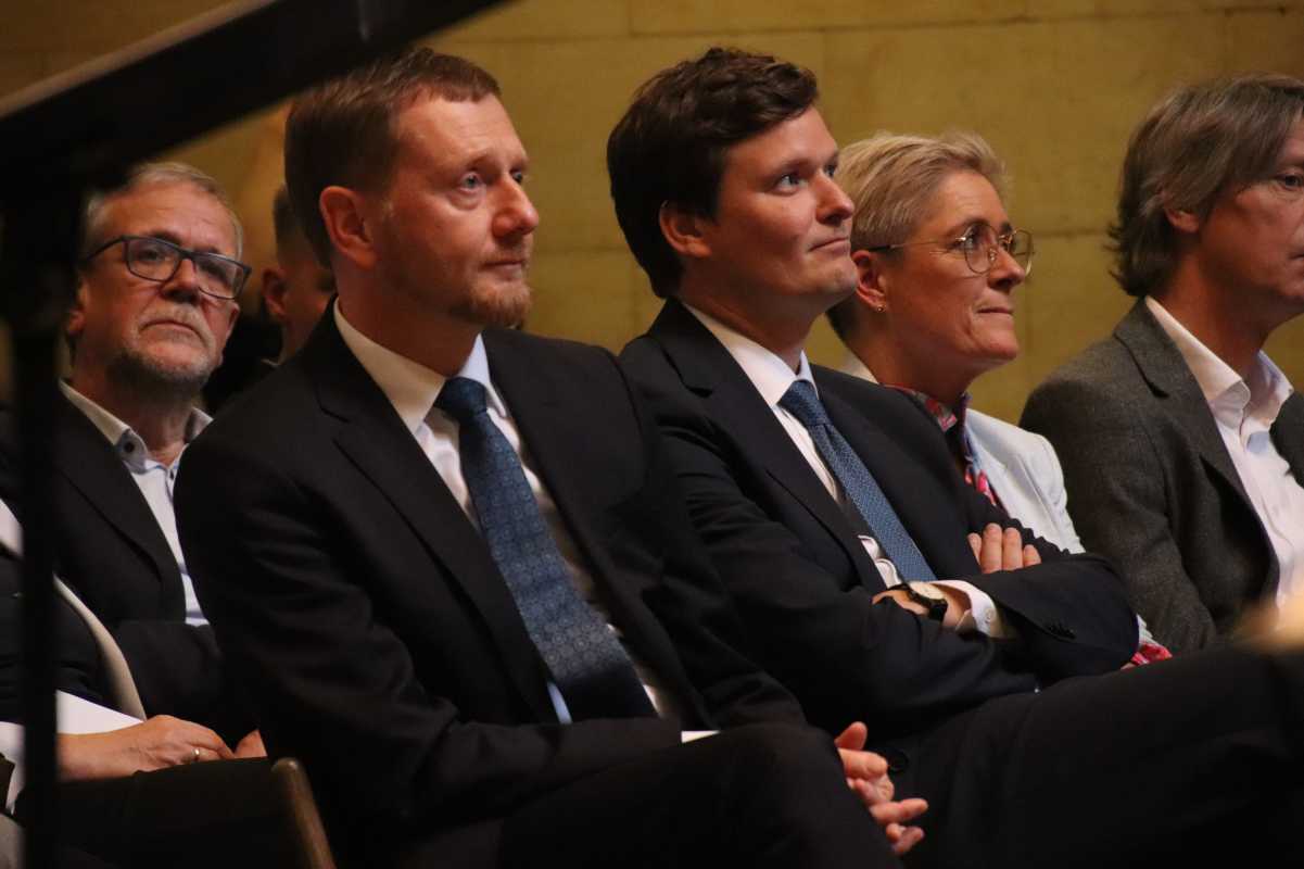 Für den Auftritt in der Staatskanzlei ging es am Donnerstag mit drei Bussen und zwei Transportern für die Instrumente nach Dresden. Der sächsische Ministerpräsident Michael Kretschmer (CDU) und der Chef der Staatskanzlei Conrad Clemens (CDU) wurden in der Kuppelhalle mit ihrer großartigen Akustik mit der Herrnhuter Sonate begrüßt.