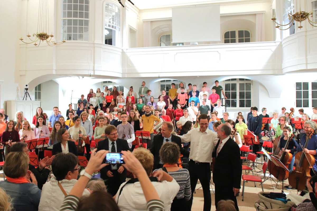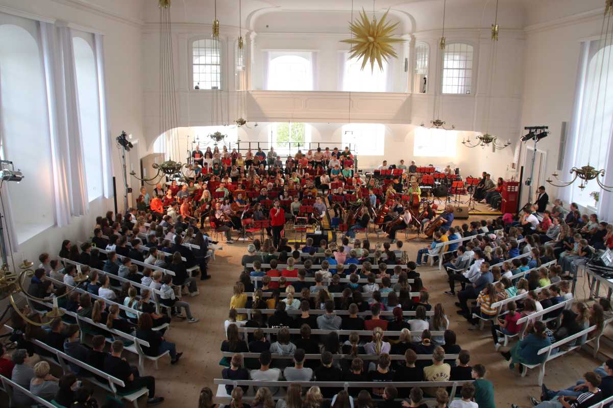 So haben insgesamt 140 Ensemblemitglieder gemeinsam geprobt und vier Konzerte gegeben: vor den Schulgemeinschaften der Johann-Amos-Comenius-Schule Herrnhut und der Evangelischen Zinzendorfschulen Herrnhut, vor der sächsischen Staatskanzlei, sowie für die große Öffentlichkeit im Herrnhuter Kirchensaal.