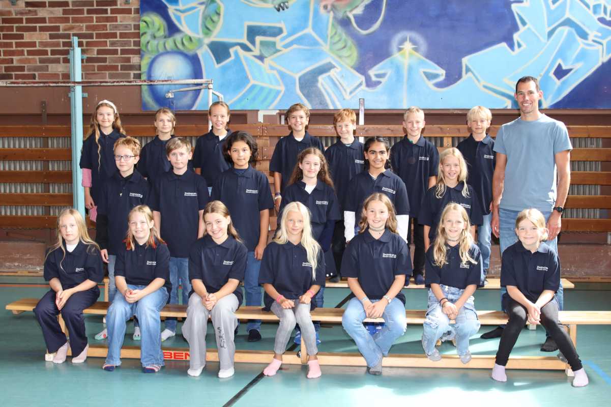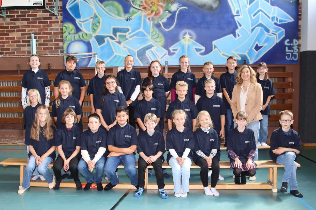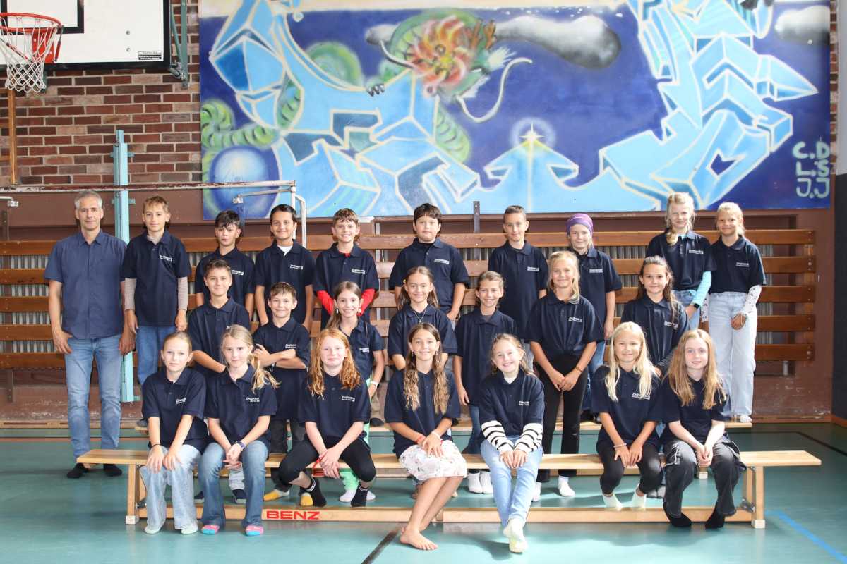 Das sind die neuen Schülerinnen und Schüler der fünften Klassen. Ihre Klassenlehrer*innen Sr. Maier, Sr. Hummel, Br. Leidig, Br. Bick und Sr. Vogt sowie Schulleiterin Sr. Terno haben sie zum ersten gemeinsamen Gruppenbild in der Turnhalle versammelt.