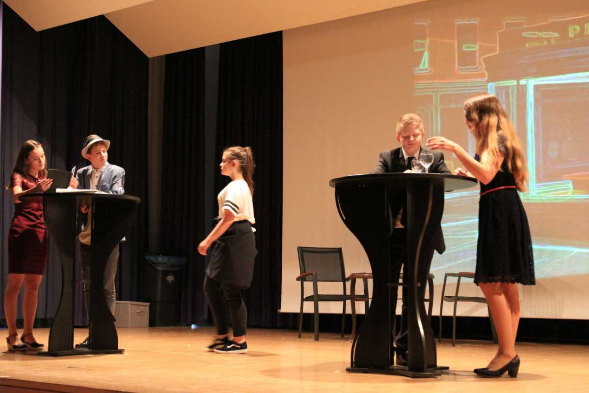 Die jungen Darsteller schlüpfen zum Teil in verschiedene Rollen (Katharina Hummel aus Ober, Designerin und Frau Wichtig; Niclas Dold als Snob und als Bettler; Xenia Baumann als Frau Nobel und als Kundin im Schuhgeschäft; Sophia Lützow als Schuhverkäuferin und als Frau Nerz) und erfüllen die oft gegensätzlichen Charaktere immer mit dem passenden Mimik, Gestik und Sprache mit Leben. Die monatelangen Proben haben gelohnt, was auch das Publikum im gut besetzten Haus des Gastes mit kräftigem Applaus zu würdigen wusste.