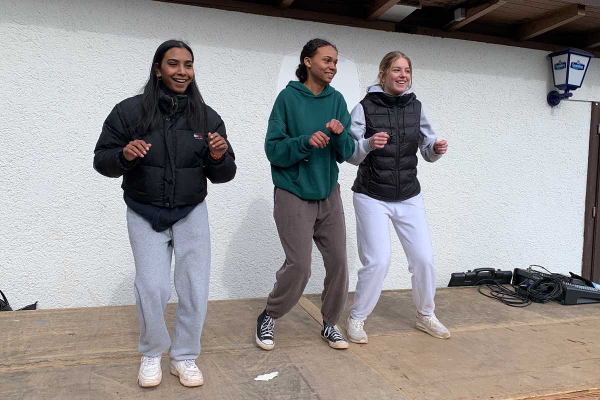 Zu den Klängen von Partymusik waren die Läuferinnen und Läufer zum Warm-Up und Dehnübungen vor dem Lauf aufgefordert. Trotzdem mussten die Schulsanitäter*innen mehrfach mit Kühlpads ausrücken, um verstauchte Knöchel zu versorgen.