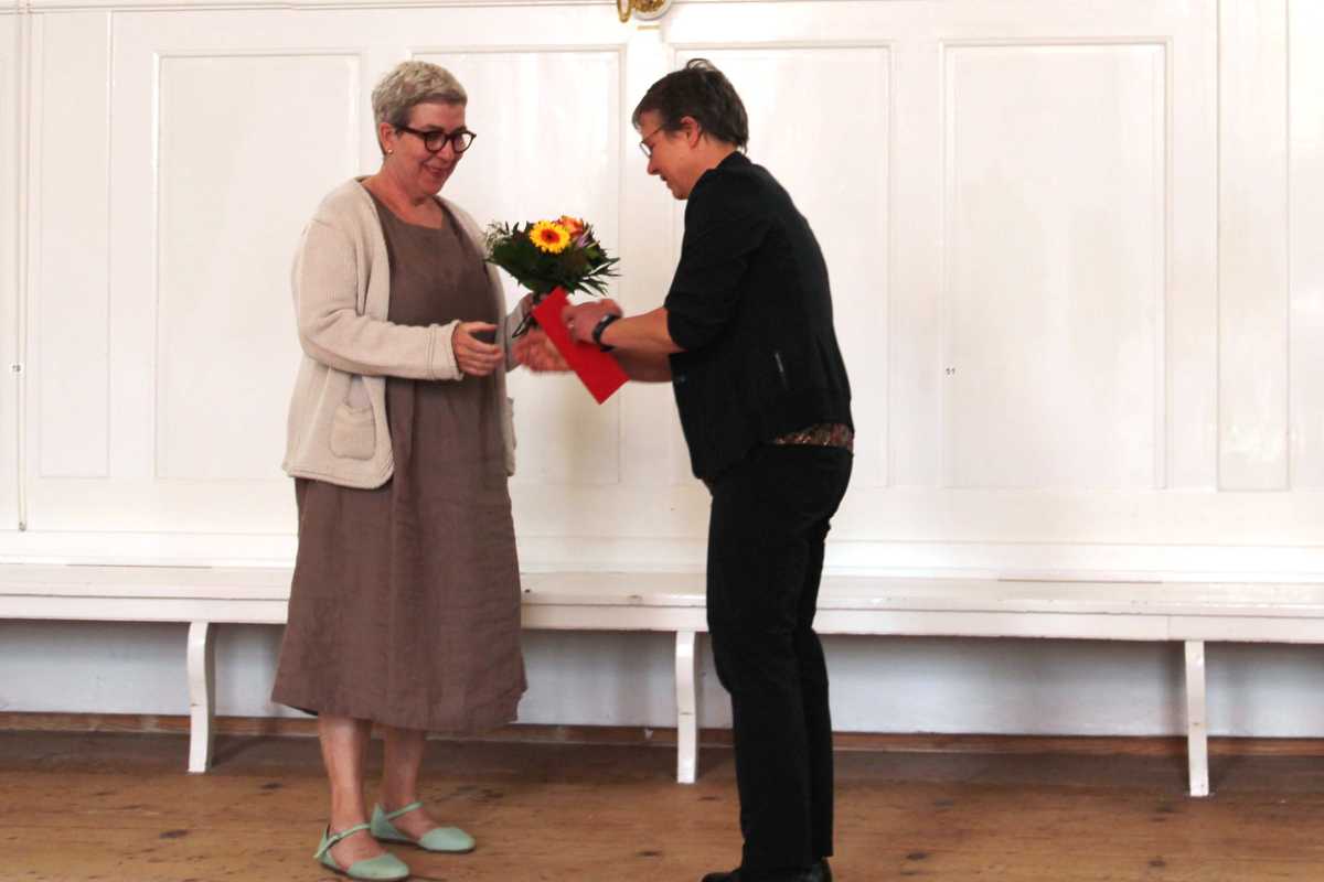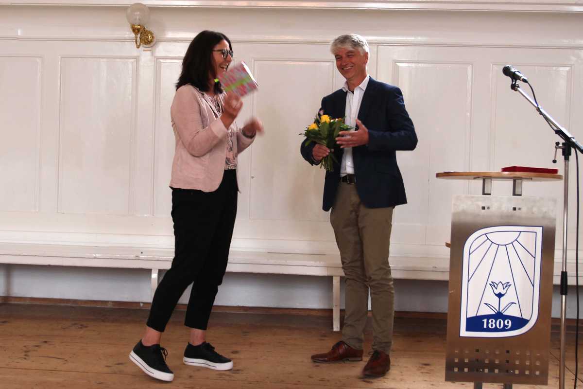 Die jeweiligen Abteilungsleiter*innen erzählten kleine Anekdoten aus dem Berufsleben der Jubilare, bevor diese aus der Hand der Schulleiterin Sr. Terno beziehungsweise des Verwaltungsleiters Br. Banholzer einen Blumenstrauß in Empfang nahmen. Seit zehn Jahren arbeiten Mechthild Fischer, Markus Luschin, Susanne Ferro und Ulrike Rieth an den Zinzendorfschulen, Bernhard Hering, Rolf Nattmann, Anna-Gina Prescha, Friederike Reis und Beatrix Feldmann konnten ihr 20-jähriges Jubiläum feiern. Für ein Vierteljahrhundert wurden Gabriele Jerke, Margarete Maurer und Johannes Michel geehrt, Roland Kyburz für 30 und Reiner Dorn für 35 Jahre. Am längsten in den Diensten des Königsfelder Schulwerks stand bei den diesjährigen Ehrungen Angelika Weißer, die seit 40 Jahren zum Team gehört.