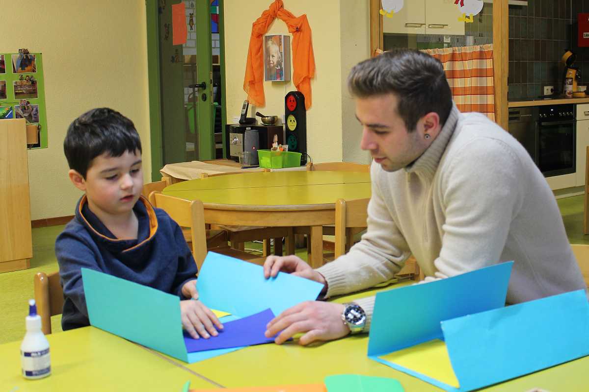 Einer der Praktikanten ist Aaron Schmitz, der das Berufskolleg für Sozialpädagogik besucht. Seit September schon absolviert er seine beiden wöchentlichen Praxistage im Kindergarten Pusteblume, ebenso wie derzeit sein achtwöchiges Blockpraktikum. „Dadurch, dass gerade so wenig Kinder hier sind, kann man besser auf die einzelnen eingehen“, sagt er. „aber natürlich ist es schon sehr schade für die Kinder, dass sie nur mit wenigen spielen können.“