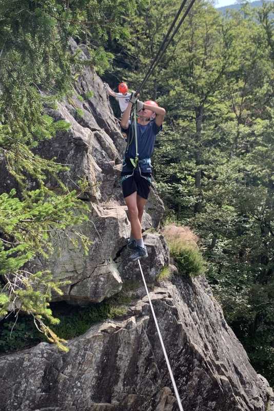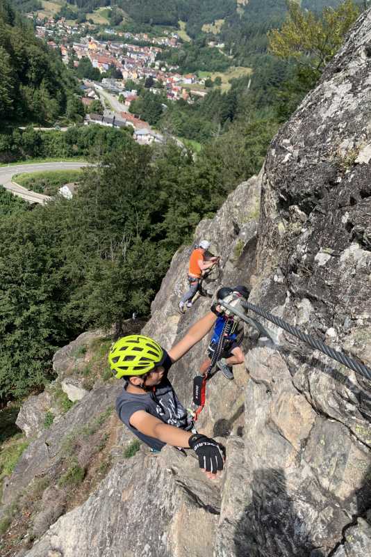 Br. Gilga war mit den Jungen und Mädchen nach Todtnau zum Klettersteig gefahren, wo ihnen ein professioneller Guide vom Deutschen Alpenverein genau erklärte, wo sie ihre Füße und Hände platzieren sollen. Später ging es dann sogar an den Felsen.