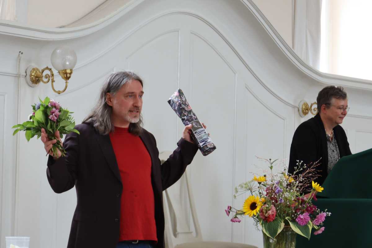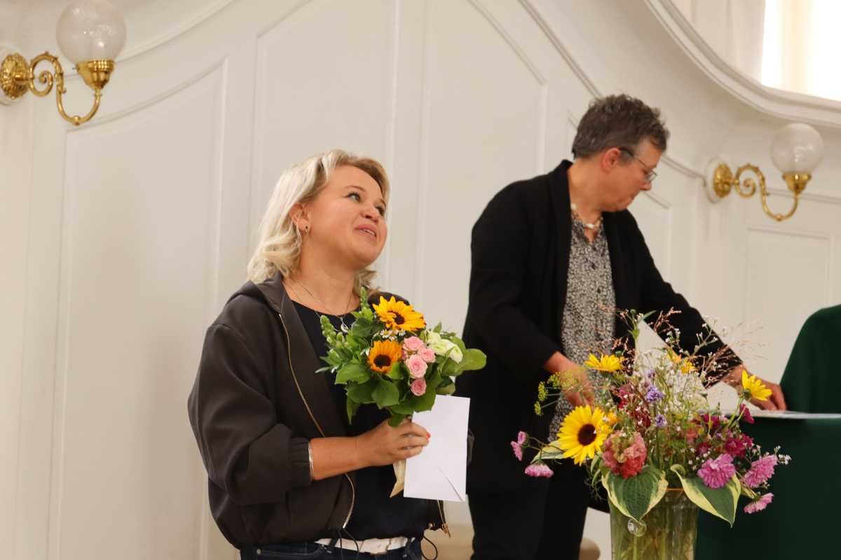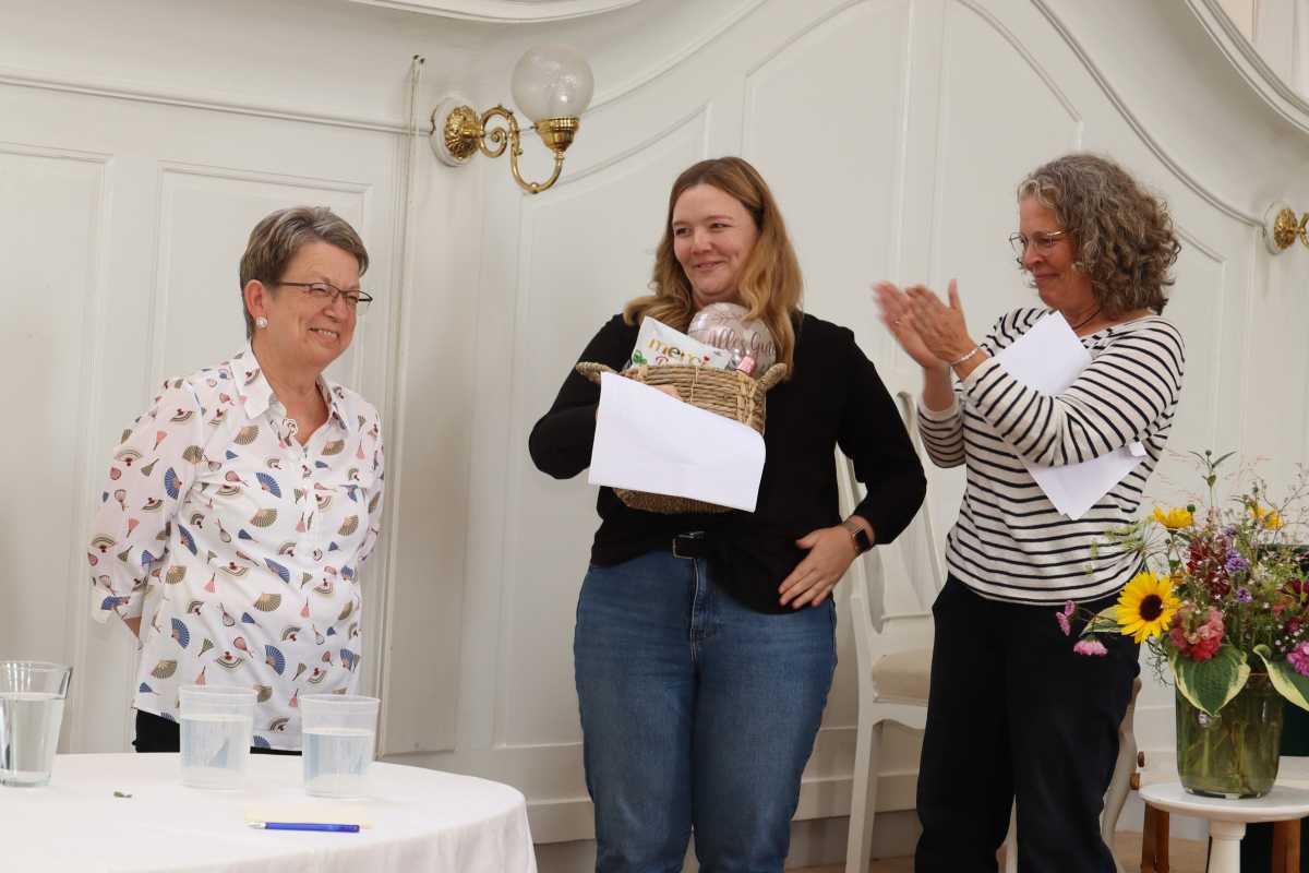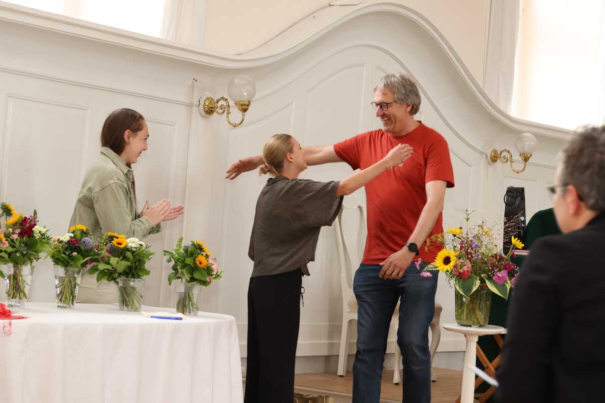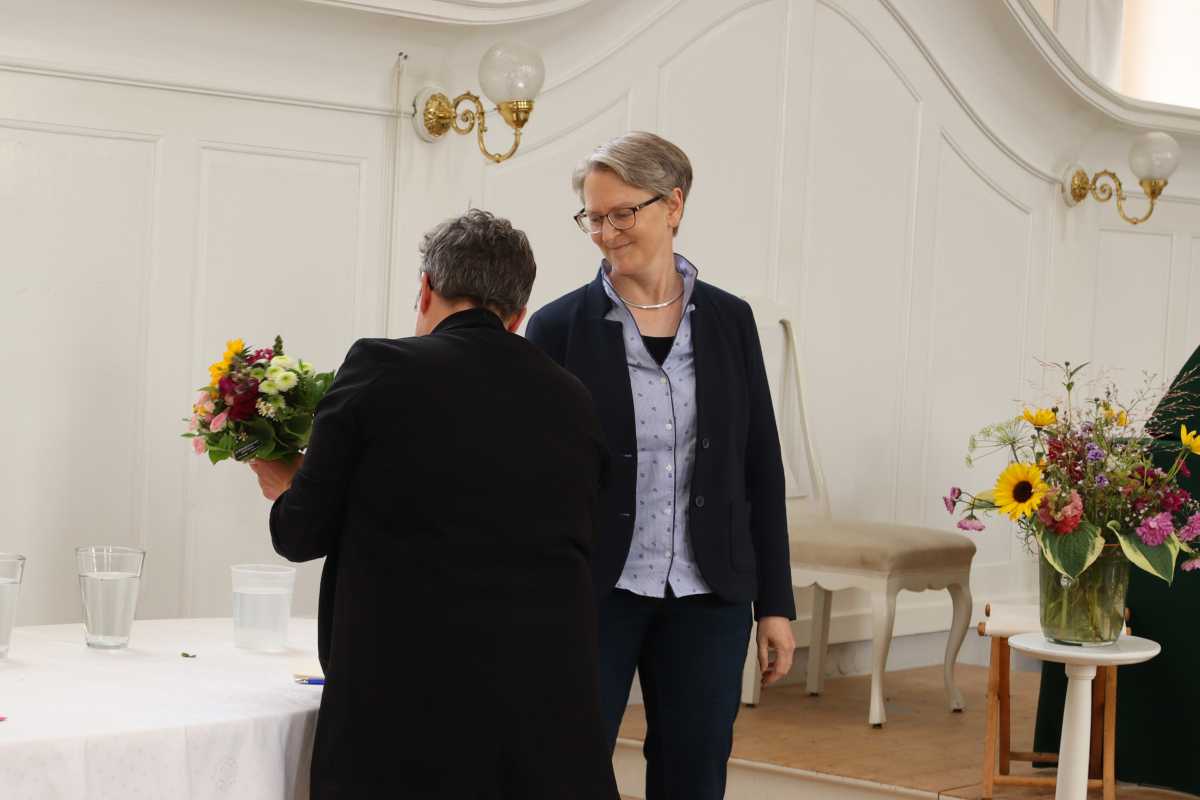 Nach 34 Jahren und 11 Monaten im Dienst – von ihr selbst in ihrer kurzen, humorvollen Dankesrede großzügig auf „35 Jahre“ aufgerundet – wurde die Deutsch- und Sportlehrerin Andrea Kyburz unter großem Applaus und stehenden Ovationen in den Ruhestand entlassen. Zuvor hatte sie noch ein letztes Mal ihre Funktion als Fachschaftsleiterin wahrgenommen und im Namen der Fachschaft Deutsch ein Geschenk an ihre Kollegin Frauke Zander überreicht. Diese, die auch Kunst unterrichtete, verlässt die Zinzendorfschulen nach über 20 Jahren und tritt ebenfalls ihren wohlverdienten Ruhestand an.