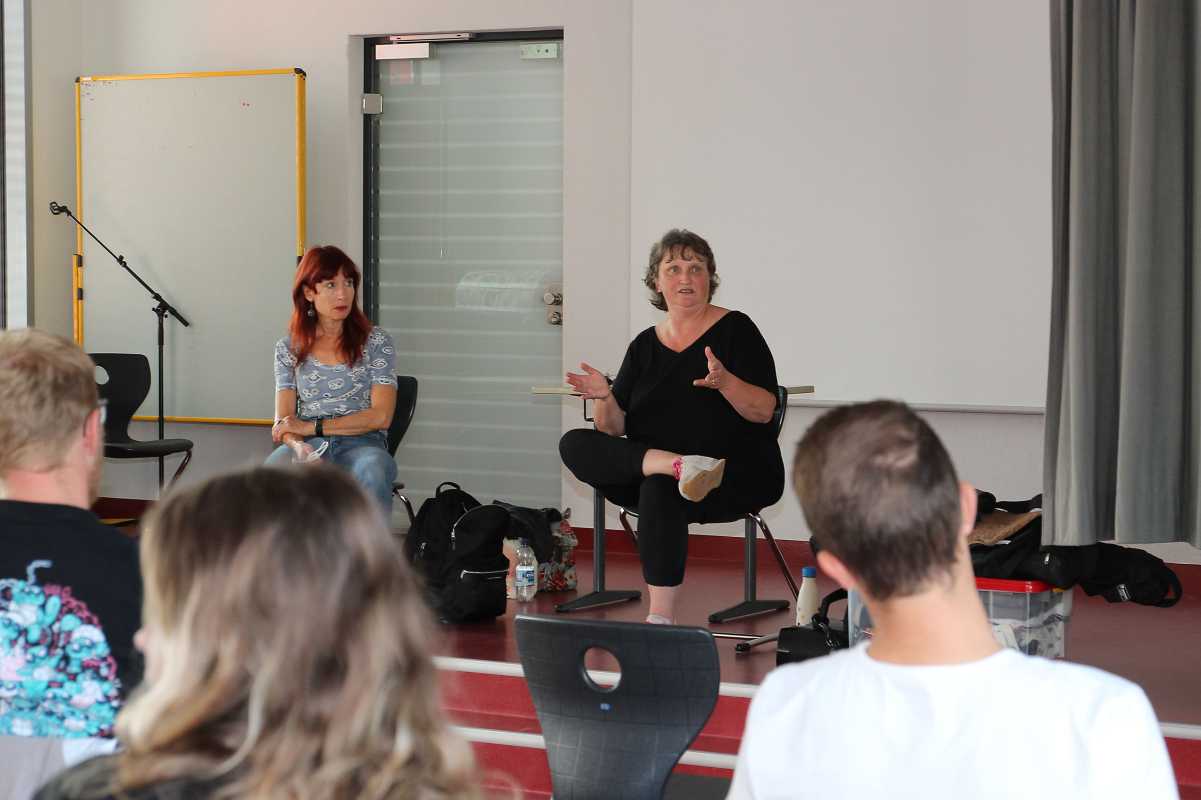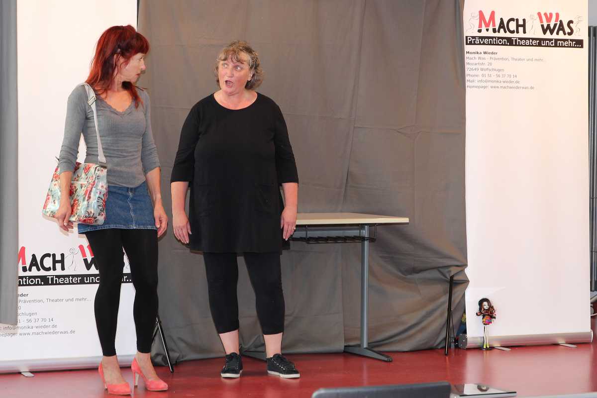 Zusammen mit ihrer Bühnenpartnerin Dorothea Baltzer inszenierte sie das Bühnenstück „Püppchen“, das sie sonst vor Schülerinnen und Schülern der fünften bis achten Klassen zeigt. Entsprechend des Publikums fiel die theaterpädagogische Nachbearbeitung wie eine kurze Fortbildung aus, denn die beiden Schauspielerinnen gaben den angehenden Jugend- und Heimerziehern viele Tipps und Tricks für ihren späteren Berufsalltag.