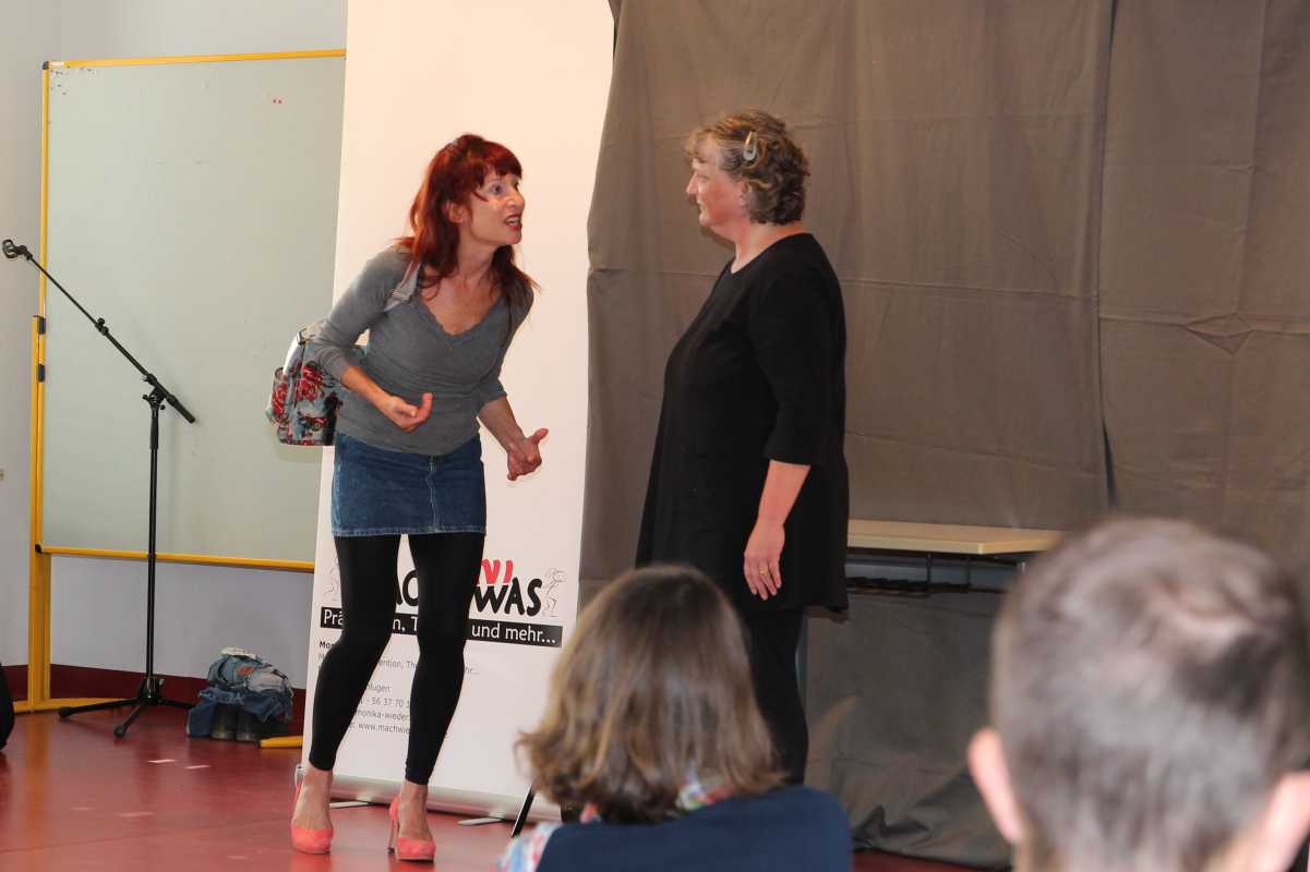 Genauso spannend wie die Nachbesprechung ist auch das Stück selbst gewesen. Die beiden Darstellerinnen überzeugten mit enormer Wandlungsfähigkeit, sie spielten mal die beiden essgestörten Mädchen Shirin und Lena, dann deren Mitschüler Torsten und Simon und sogar die Eltern der Protagonisten. Die Geschichte der Bulimikerin Lena und der magersüchtigen Shirin ist kurzweilig und sensibel erzählt.