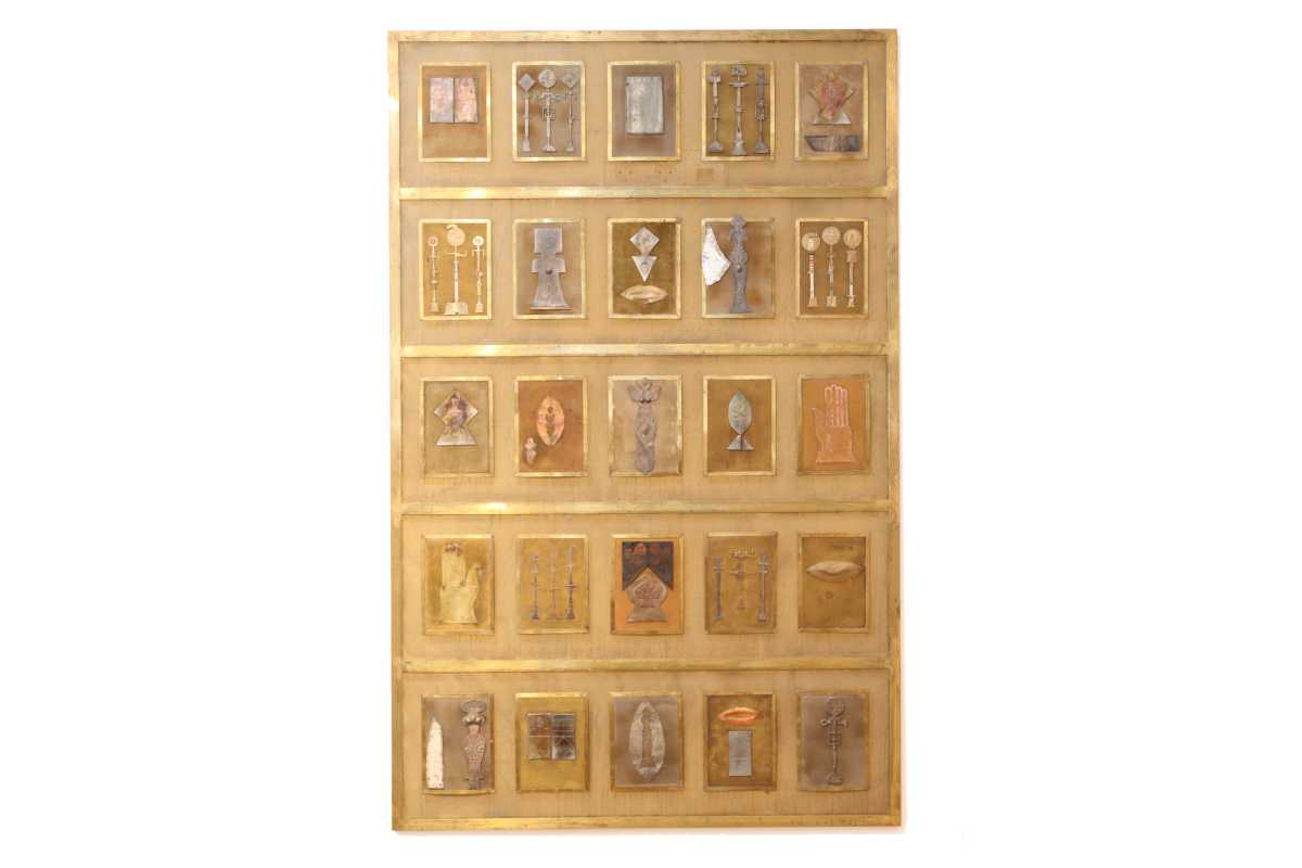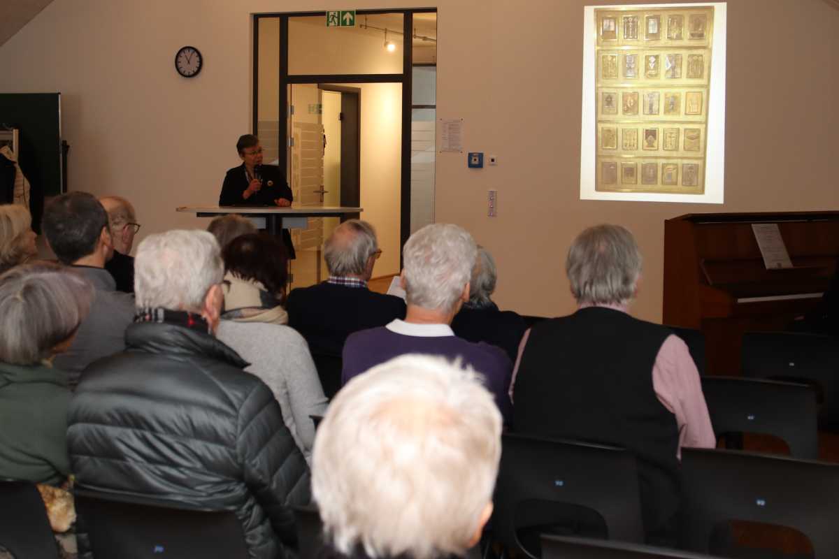 Das Kunstwerk ohne Titel sprach für sich, denn „Jochen Winckler hat seine Werke jeder Interpretation entzogen“, wie Schulleiterin Sr. Terno erklärte, bevor Details der aus vielen Elementen bestehenden Metallarbeit in einer Diashow gezeigt wurden. Auch andere Werke waren als Foto oder in einem Film über eine Ausstellung zu sehen.
