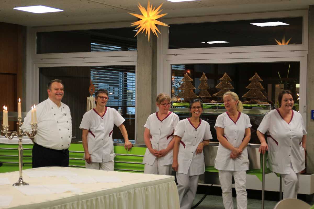 Br. Wittmann dankte auch den Mitarbeitern, die in diesem Jahr kein Jubiläum zu feiern hatten, dafür, dass sie ihre Kraft und ihren Ideenreichtum zum Wohle des Schulwerks eingesetzt hatten. Ein besonderes Lob galt dem Küchenteam, dem es mit dem kalt-warmen Buffet zur Weihnachtsfeier wieder einmal gelungen war, sich selbst zu übertreffen. Der Schuldezernent der Herrnhuter Brüdergemeine, Br. Reichel, überreichte Ulrike Neumeier von der Zentralküche zum Dank das neu erschienene Kochbuch zu den Losungen mit Rezepten aus aller Welt.