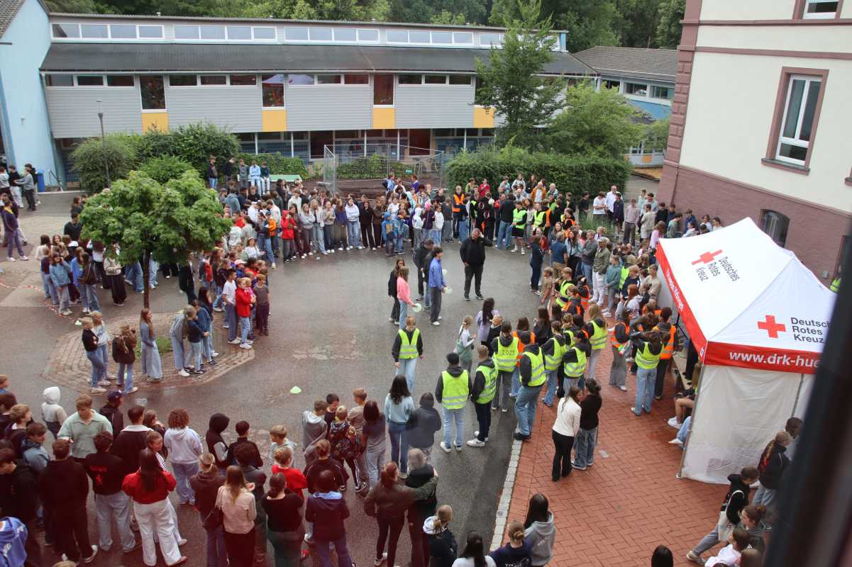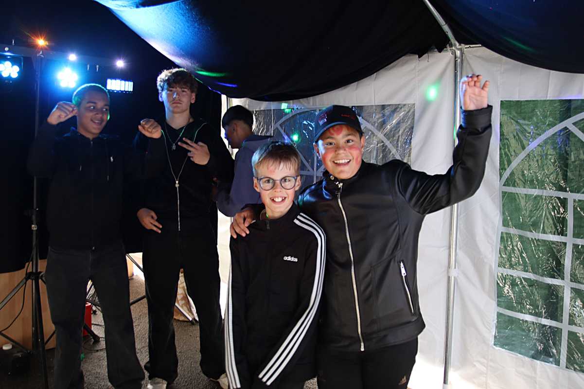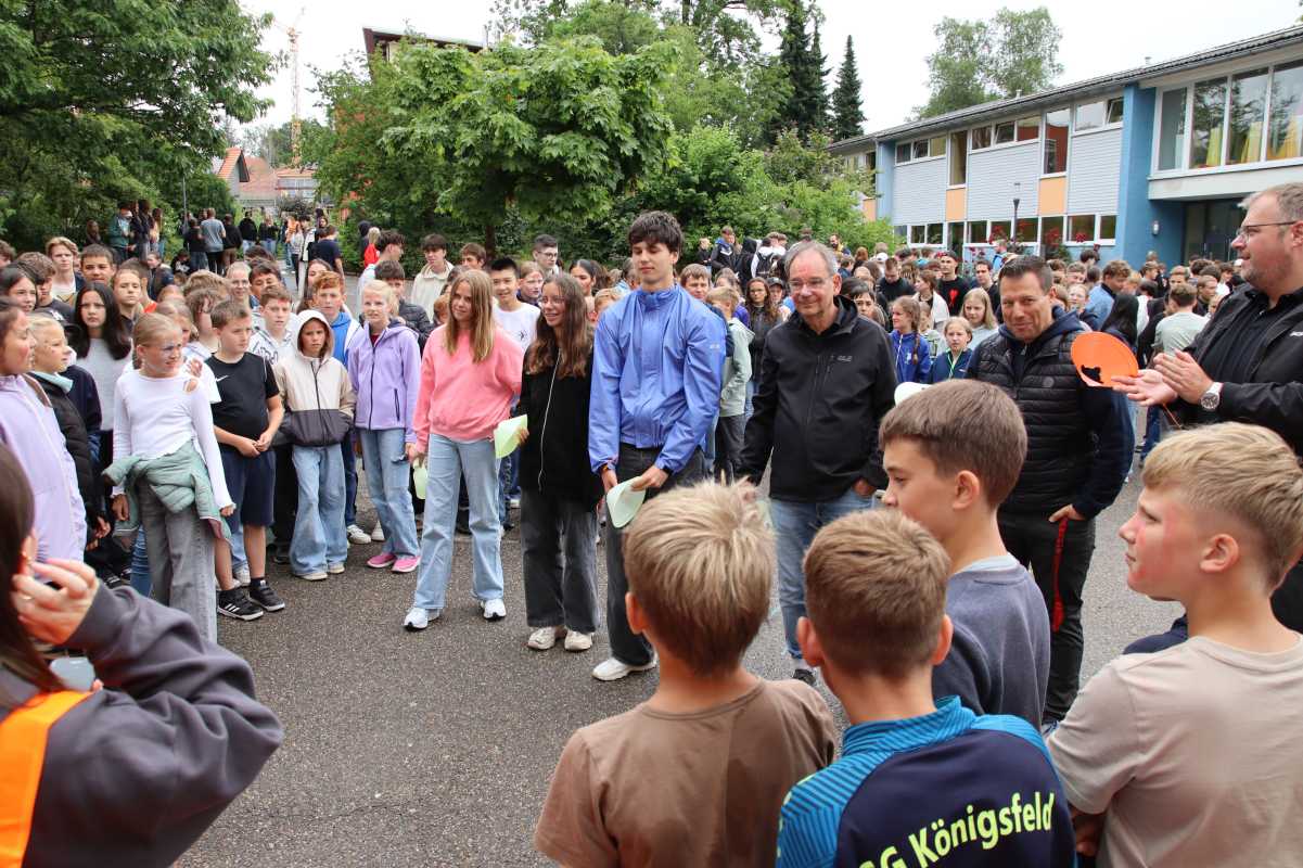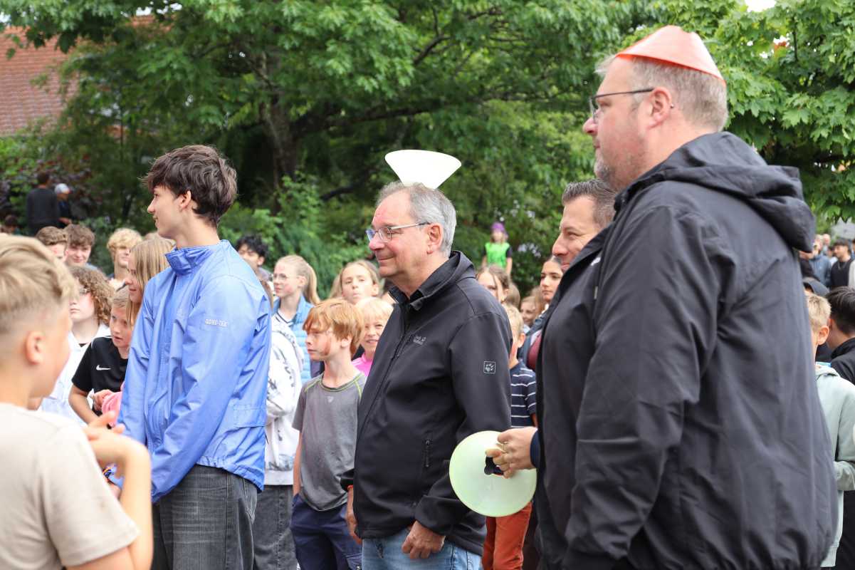 Schon früh am Morgen wurde der Schulhof in eine Festmeile verwandelt – mit Flatterband, Lautsprechern, Kunstnebel und einem Partyzelt als Eingangstor. Selbst der Parkplatz blieb nicht verschont – sehr zum Leidwesen der Kolleg*innen, die sich plötzlich mit Umwegen konfrontiert sahen.