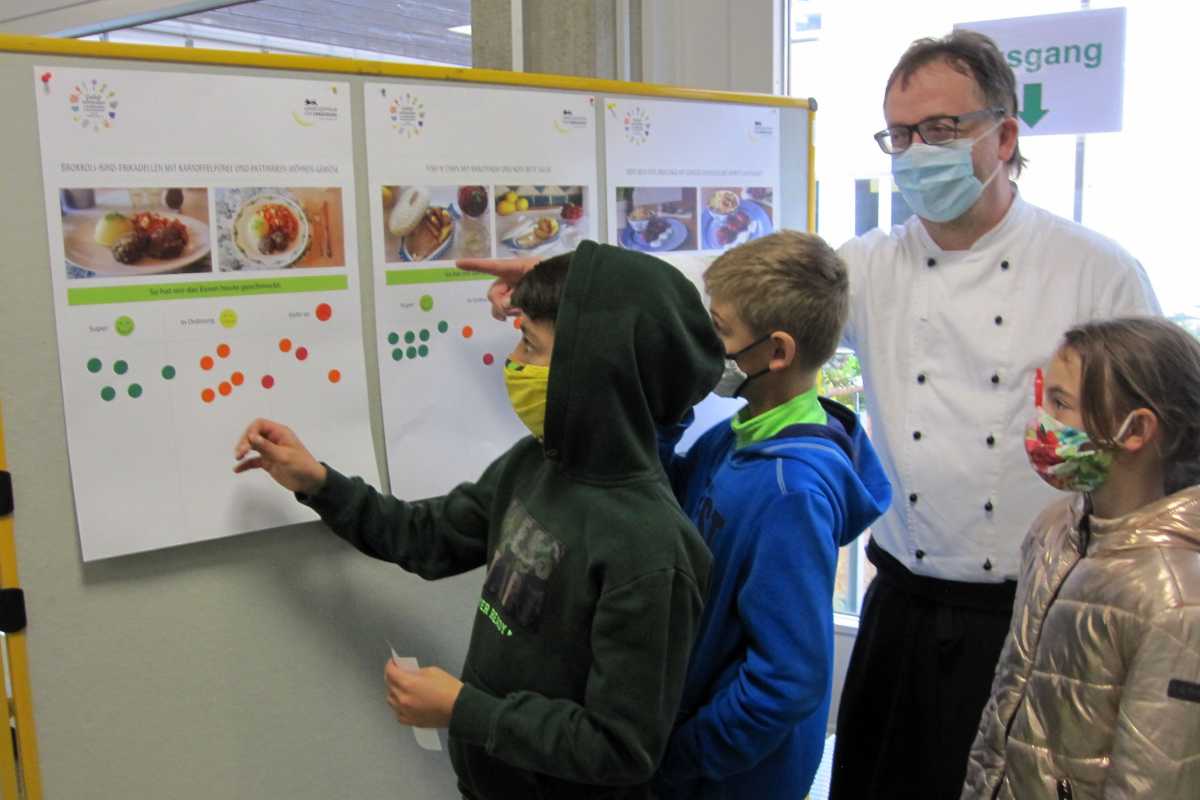 Nach dem Essen durften alle die Gerichte bewerten, indem sie den Geschmack mit Klebepunkten als „super“, „in Ordnung“ und „geht so“ einordneten. Die meisten Schüler hatten sich für die Brokkoli-Rind-Frikadellen entschieden. „Mit solchen Rezepten sollen normale Gerichte mit Gemüse aufgewertet werden“, erklärte Sr. Helms, die als Praxisbegleiterin Kita- und Schulverpflegung BW die Klassen in der Lehrküche betreute. Alle waren vom Geschmack nicht begeistert, beim Fisch dagegen lagen die Aufkleber in der Spalte „super“ proportional deutlich höher.