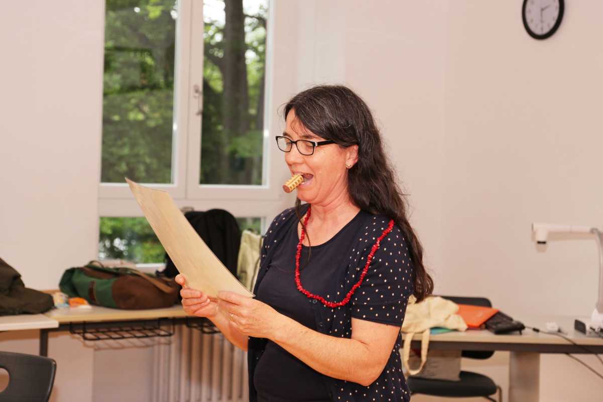 Im nächsten Schritt müssen sie die Sätze mit einem Korken im Mund artikulieren und sofort danach den gleichen Satz noch einmal ohne Korken. „Toll, das war eine Steigerung um 200 Prozent im Vergleich zum Beginn des Seminars“, lobt Beate Weiß eine Teilnehmerin. Dabei achtet sie auch auf Kleinigkeiten, die den Schülern oft gar nicht bewusst sind – wie etwa, dass einige reflexartig die Hände in die Taschen stecken.