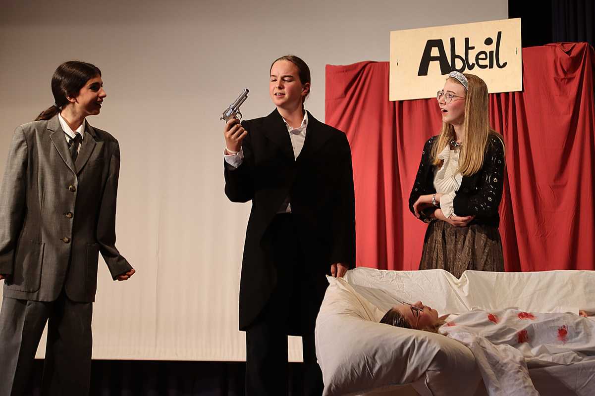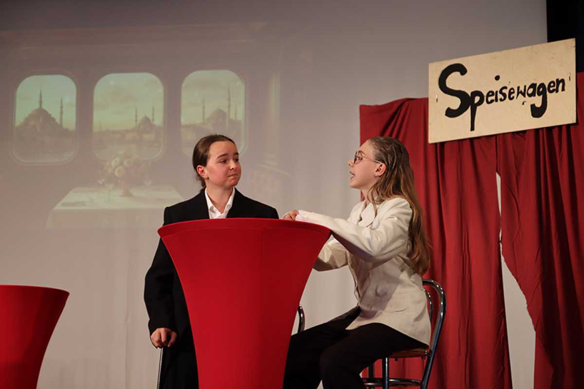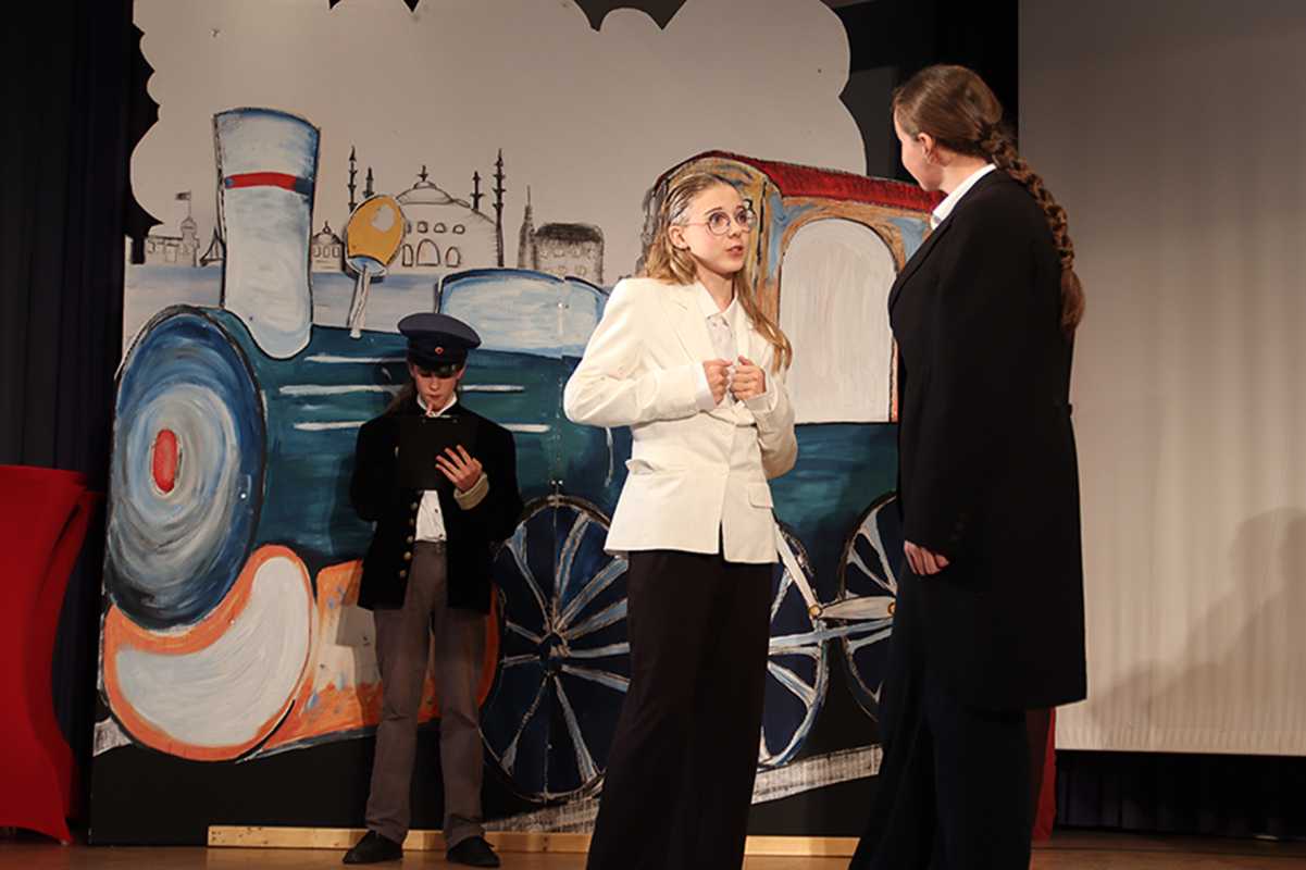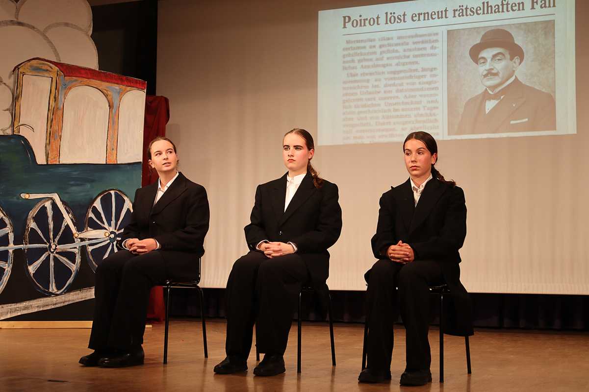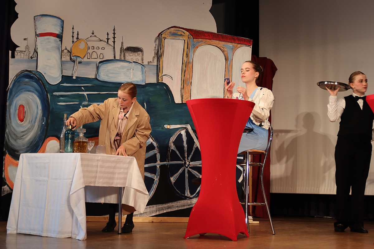 So vielfältig wie der Mordfall waren auch die Talente auf der Bühne: Weil sich in der Theater-AG über die Jahre viele begabte Schauspielerinnen und Schauspieler zusammengefunden haben, ließen sich die Regisseure Claudius Schiffer und Laura Lindemann einen besonderen Kunstgriff einfallen – einige Rollen wurden mehrfach besetzt. So gab es gleich drei Poirots (Clara Borowski, Helena Janiszewski, Luisa Ege), aus Prinzessin Dragomiroff wurden zwei Adlige (Jule Schmidt, Kiara Dik) und Greta Ohlsson (Ylva Hak) bekam mit Greti (Emily Hagen) kurzerhand eine Schwester.