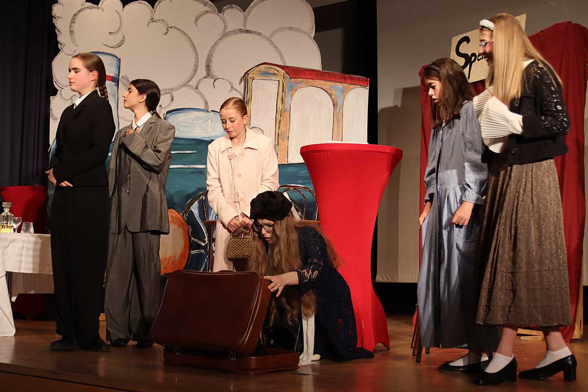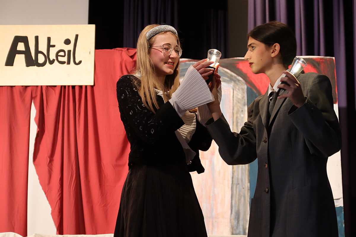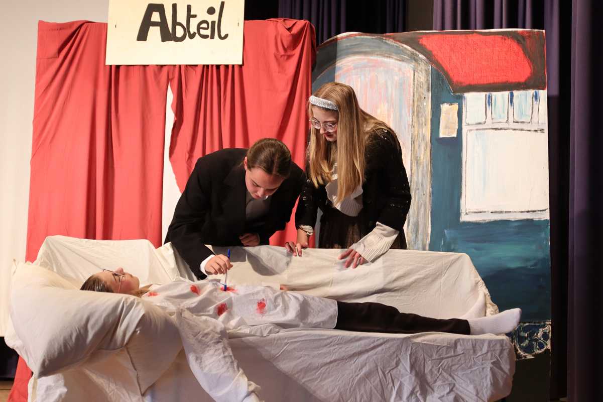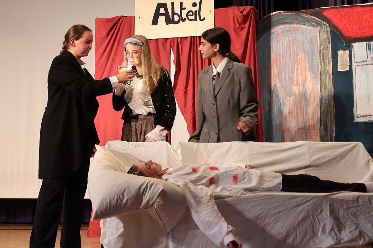 So vielfältig wie der Mordfall waren auch die Talente auf der Bühne: Weil sich in der Theater-AG über die Jahre viele begabte Schauspielerinnen und Schauspieler zusammengefunden haben, ließen sich die Regisseure Claudius Schiffer und Laura Lindemann einen besonderen Kunstgriff einfallen – einige Rollen wurden mehrfach besetzt. So gab es gleich drei Poirots (Clara Borowski, Helena Janiszewski, Luisa Ege), aus Prinzessin Dragomiroff wurden zwei Adlige (Jule Schmidt, Kiara Dik) und Greta Ohlsson (Ylva Hak) bekam mit Greti (Emily Hagen) kurzerhand eine Schwester.