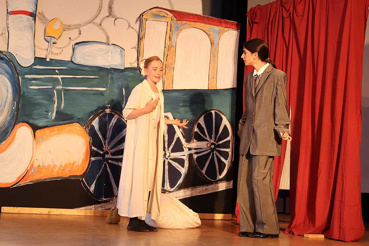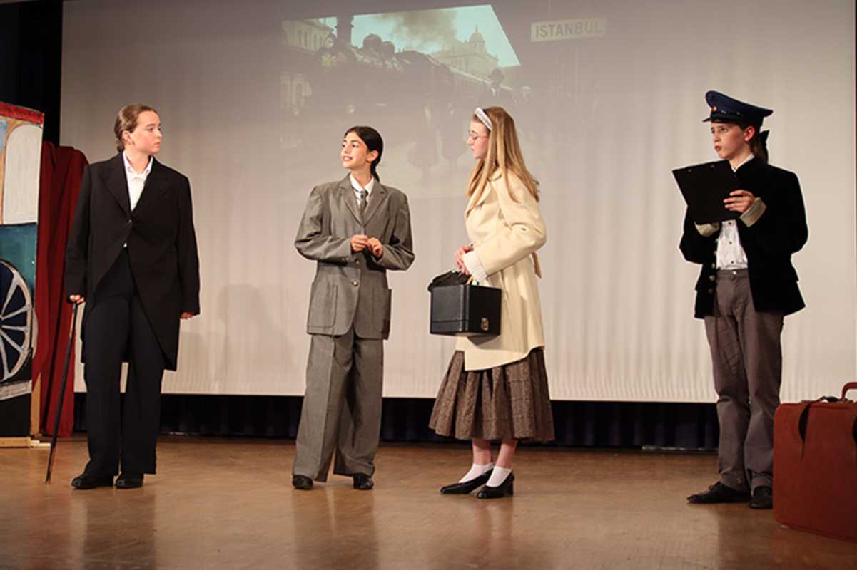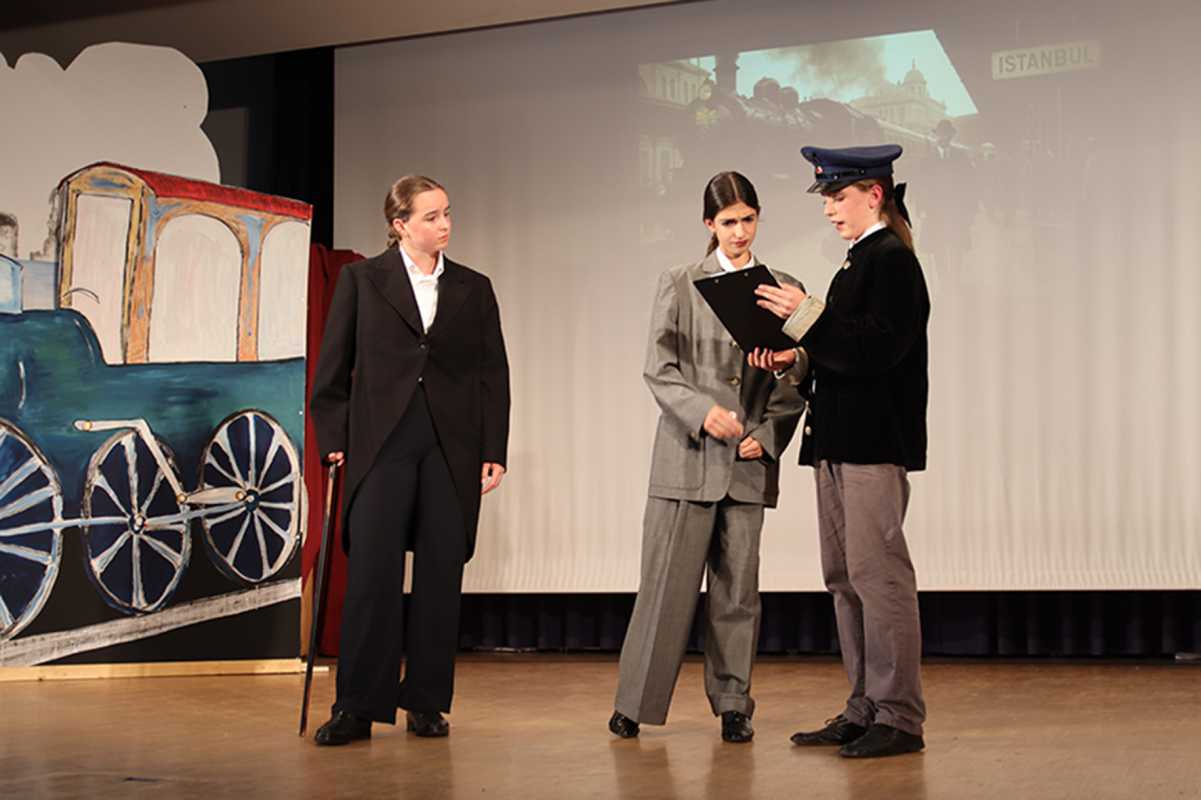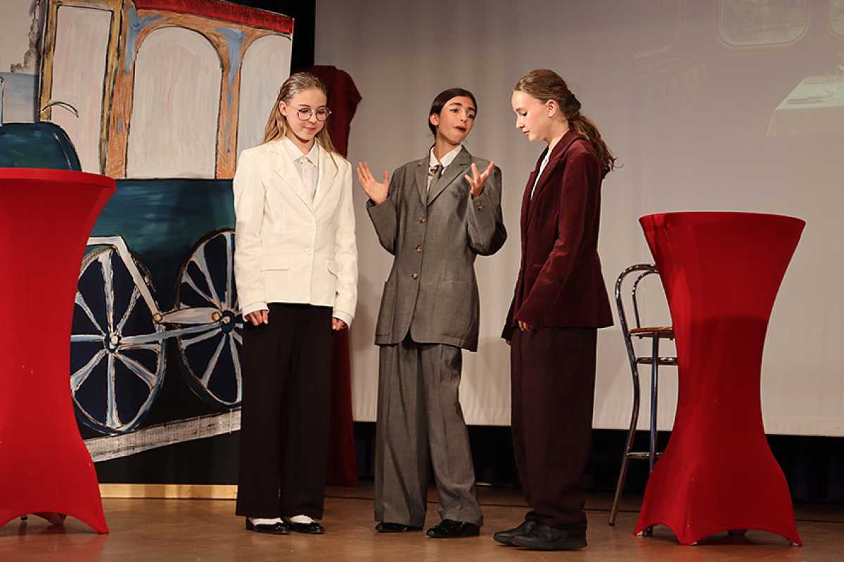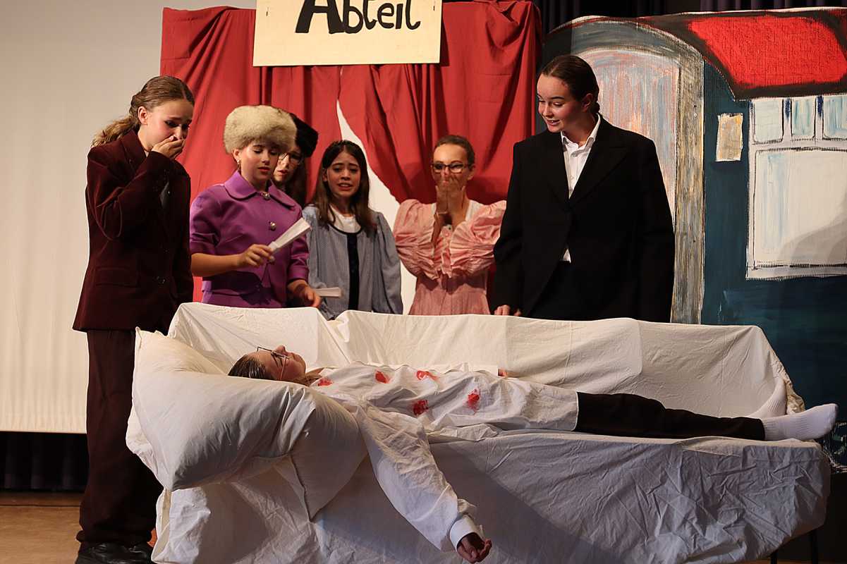 So vielfältig wie der Mordfall waren auch die Talente auf der Bühne: Weil sich in der Theater-AG über die Jahre viele begabte Schauspielerinnen und Schauspieler zusammengefunden haben, ließen sich die Regisseure Claudius Schiffer und Laura Lindemann einen besonderen Kunstgriff einfallen – einige Rollen wurden mehrfach besetzt. So gab es gleich drei Poirots (Clara Borowski, Helena Janiszewski, Luisa Ege), aus Prinzessin Dragomiroff wurden zwei Adlige (Jule Schmidt, Kiara Dik) und Greta Ohlsson (Ylva Hak) bekam mit Greti (Emily Hagen) kurzerhand eine Schwester.