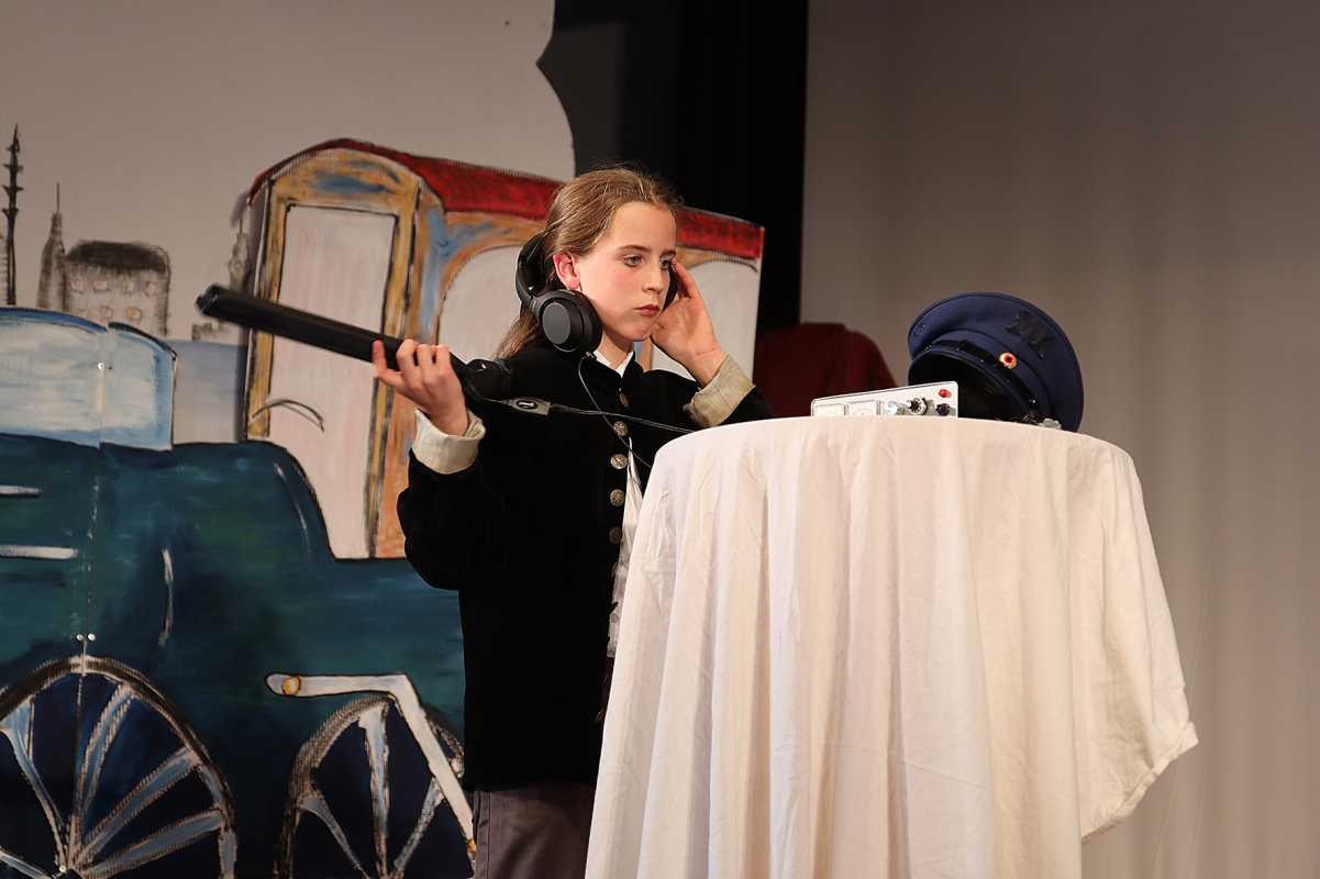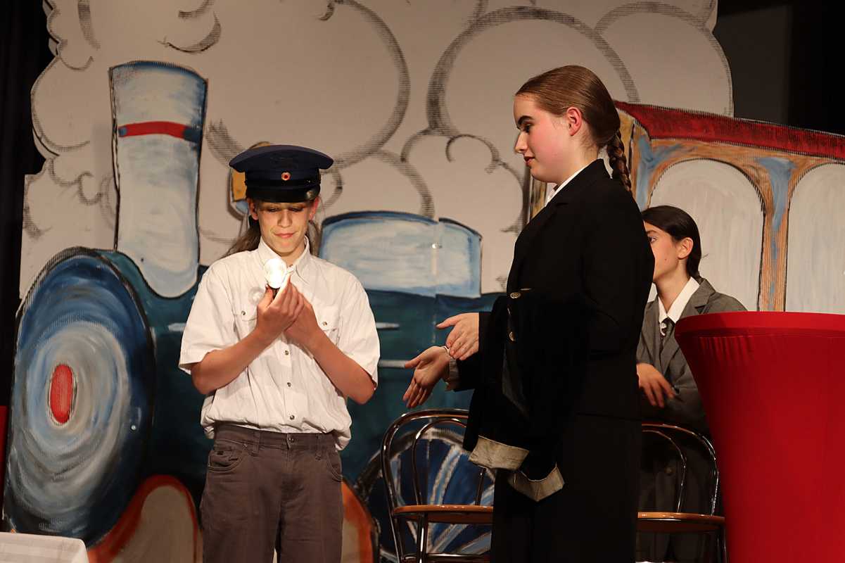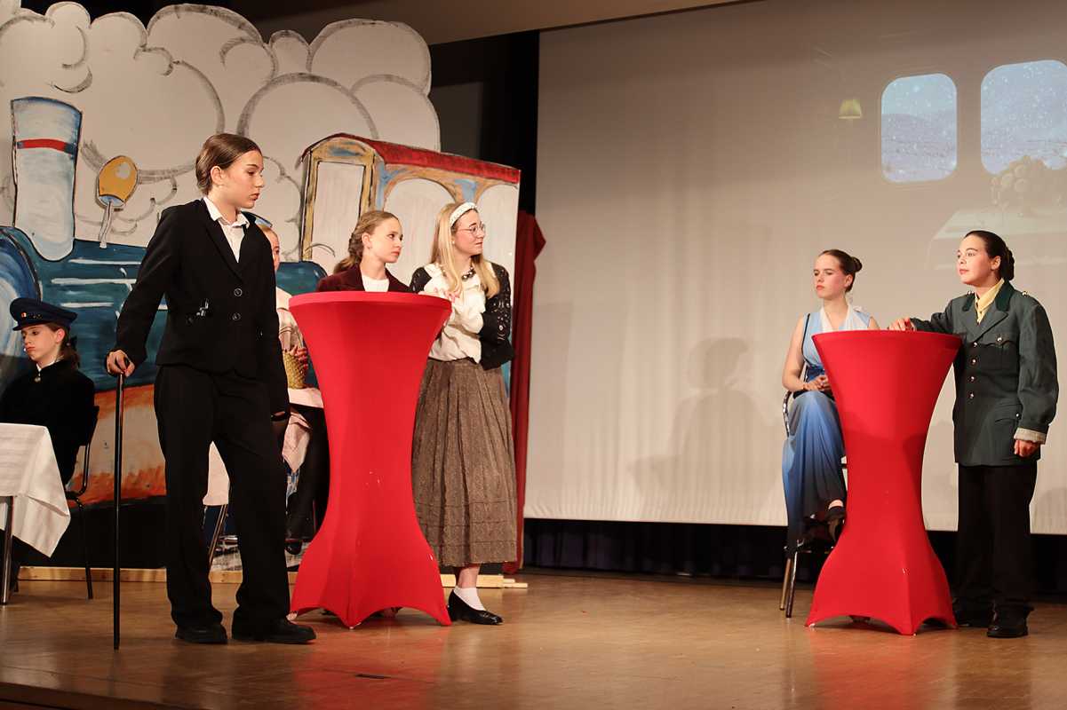 Das Ensemble nahm sein Publikum mit auf eine Reise voller Rätsel, falscher Fährten und überraschender Wendungen. Auch die aufwendig gestaltete Kulisse trug zur dichten Atmosphäre bei: Unter der Leitung von Kunstlehrerin Anna Saurer entstanden Bühnenbilder mit vielen liebevollen Details wie Rauch aus dem Lok-Schornstein. Wirbelnde Schneeflocken, die während des Sturms durch das Fenster zu sehen waren, sorgten ebenfalls für überraschte Gesichter im Publikum.