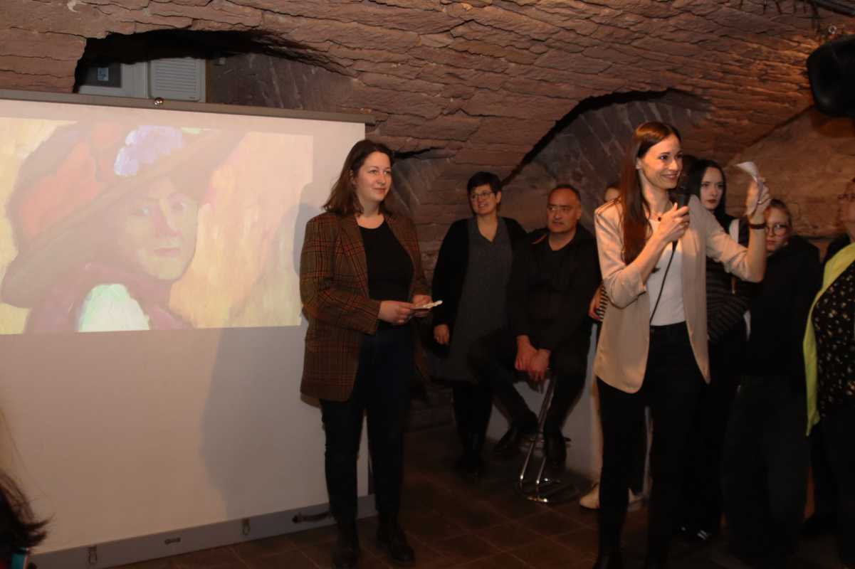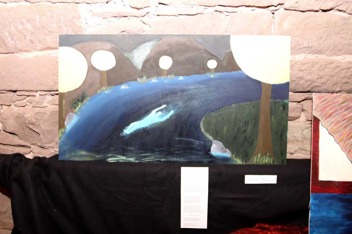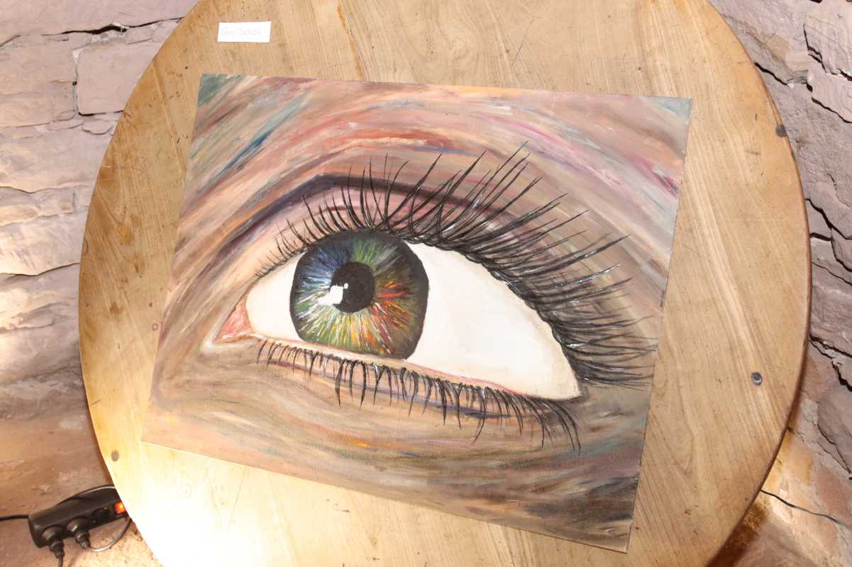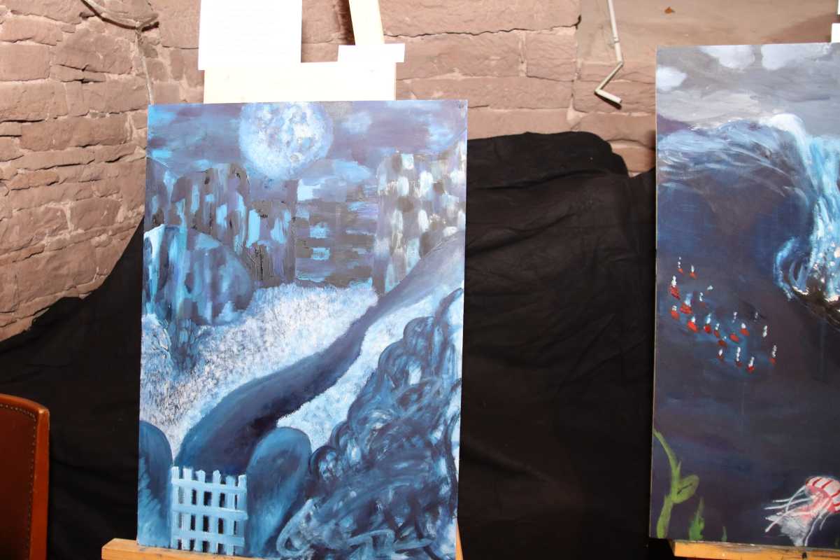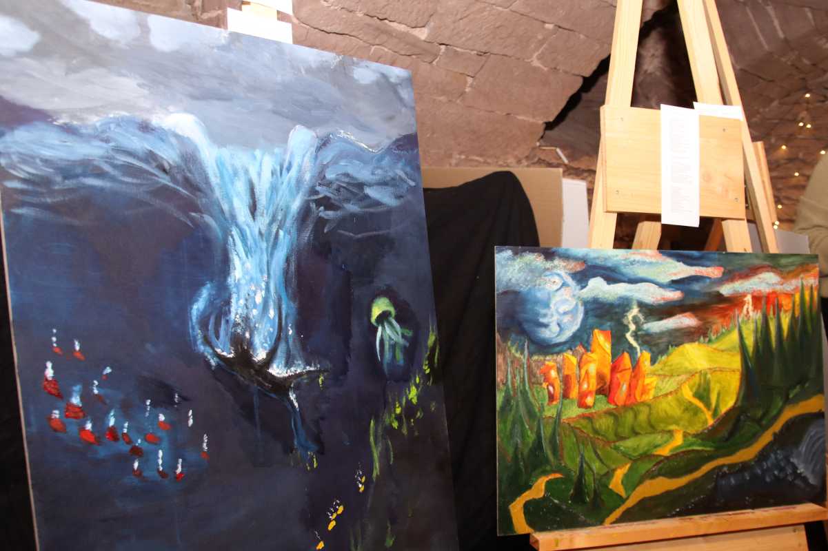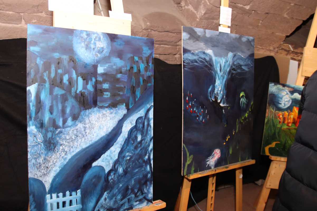 Es waren vor allem Gemälde von Schüler*innen des Kunstprofils ausgestellt, die über mehrere Wochen Werke zu expressionistischen Gedichten erarbeitet haben. Neben Ölgemälden waren auch Zeichnungen, selbst gestaltete Buchcover und Objektkunst zu sehen. Dazu gestalteten die Jugendlichen ein buntes Bühnenprogramm mit Liedern, Videos und dem Vortrag von expressionistischen und selbstgeschriebenen Gedichten.
