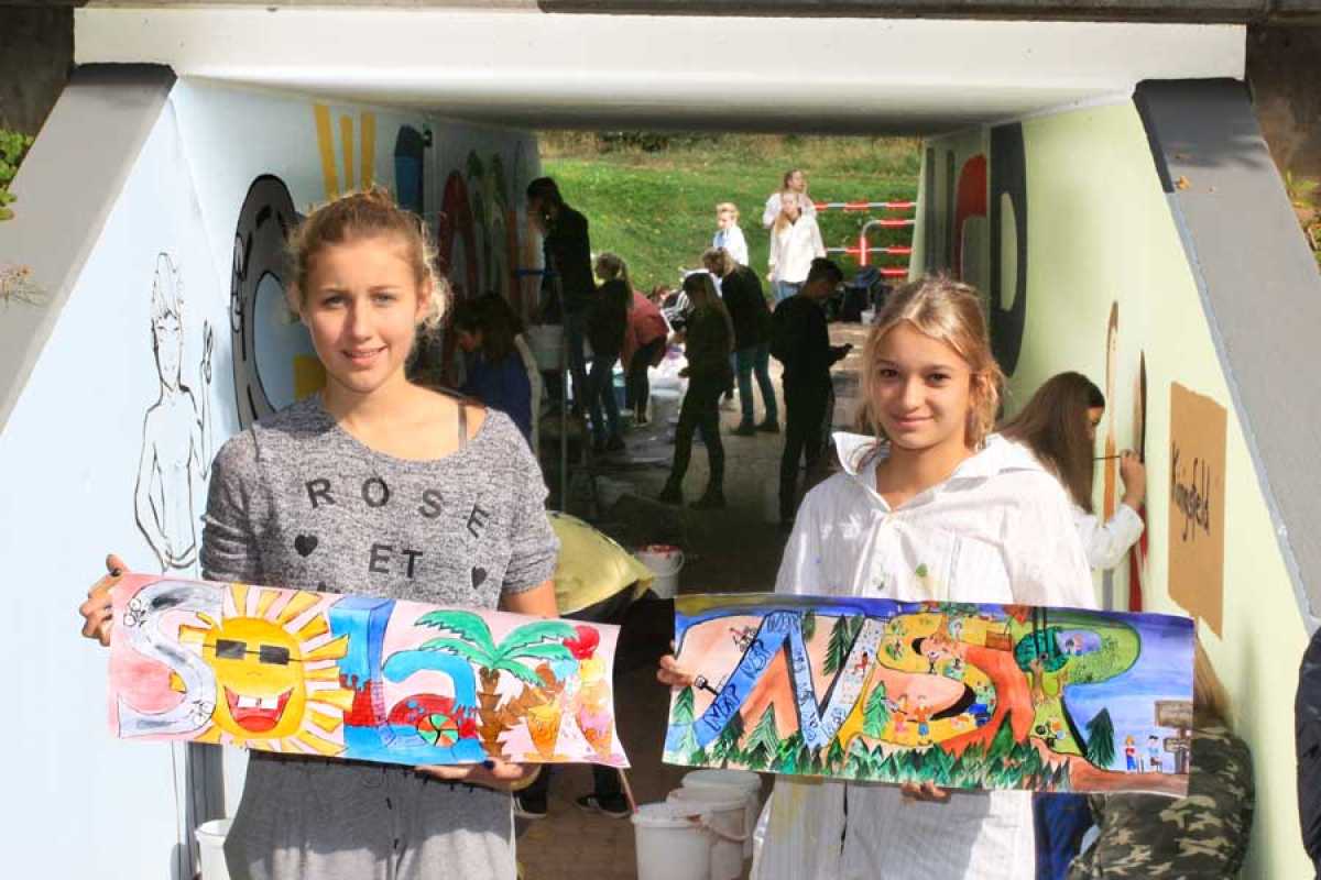 Da kommt der Sommer doch gleich nochmal zurück: Schülerinnen und Schüler der Realschule und der Gymnasien gestalten bei schönstem Herbstwetter gerade die Unterführung zum Königsfelder Freibad Solara neu. Im vergangenen Schuljahr hatte die 8R im Kunstunterricht von Br. Hertnagel Skizzen für eine Neugestaltung angefertigt. In Absprache mit der Gemeinde fiel die Wahl auf die Entwürfe von Vanessa Kasseckert und Lucia Kramer. Nun setzten gut 20 Kunstbegeisterte die beiden Entwürfe um.Auf der einen Seite sind die einzelnen Buchstaben des Wortes „Solara“ stilisiert, das „O“ zum Beispiel ist eine Sonne, das „R“ wird aus einer Palme gebildet und das letzte „A“ aus zwei gut gefüllten Eiswaffeln. Die gegenüberliegende Wand ist dem Natursportpark gewidmet mit allem, was da so geboten wird – von Klettern über Skaten bis zum Biken. Die Bäume kommen natürlich auch nicht zu kurz.