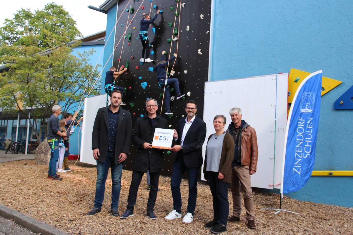 14000 Euro waren allein für die Wand samt Unterbau an der Fassade des Amos-Comenius-Hauses nötig, hinzu kamen 3500 Euro an Ausrüstung wie Seilen, Karabinern und Gurten. Die EGT AG, die sich seit zehn Jahren als Bildungspartner der Zinzendorfschulen engagiert, förderte die Kletterwand mit 10000 Euro. „Das war uns eine große Hilfe“, bedankte sich Schulleiterin Sr. Terno beim EGT-Vorstand Jens Buchholz.