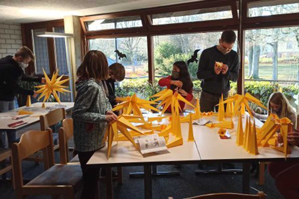 Weil die schönen Papier-Adventssterne aus Brandschutzgründen nicht mehr aufgehängt werden dürfen, bastelten sie neue Herrnhuter Sterne aus Bausätzen zusammen. Die Kinder aus den Klassenstufen 5-9 haben für einen Stern etwa ein bis eineinhalb Stunden gebraucht. In der Adventszeit schmücken die festlichen Sterne das Schulwerk.