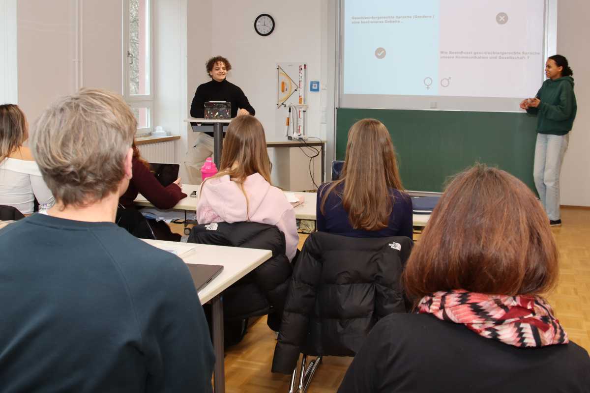 Die Themen waren spannend und von großer Vielfalt: Radu Posea und Frederike Reimann etwa widmeten sich der gendergerechten Sprache und schlugen in ihrer Präsentation einen Bogen vom historischen Kontext über die Entwicklung der Sprache bis hin zur Gegenwart. Ein anderes Team forschte über mentale Stärke im Sport, erklärte die Unterschiede zwischen Selbstregulation und Selbstkontrolle und führte ein Video-Interview mit einem Mental-Coach. Leonie Brucker schilderte ihren Mitschülerinnen und Mitschülern die Ergebnisse ihrer Forschung zu Judith Kerrs Roman „Als Hitler das rosa Kaninchen stahl“, ein Beitrag im Themenbereich American Dream und Exilliteratur. Ihre Fragestellung war, inwiefern dieser Roman zur Auseinandersetzung mit dem Nationalsozialismus beigetragen hat. Bei ihrem Vortrag ging sie auch auf die Biografie der Autorin und die Entwicklung der Gesellschaft ein.