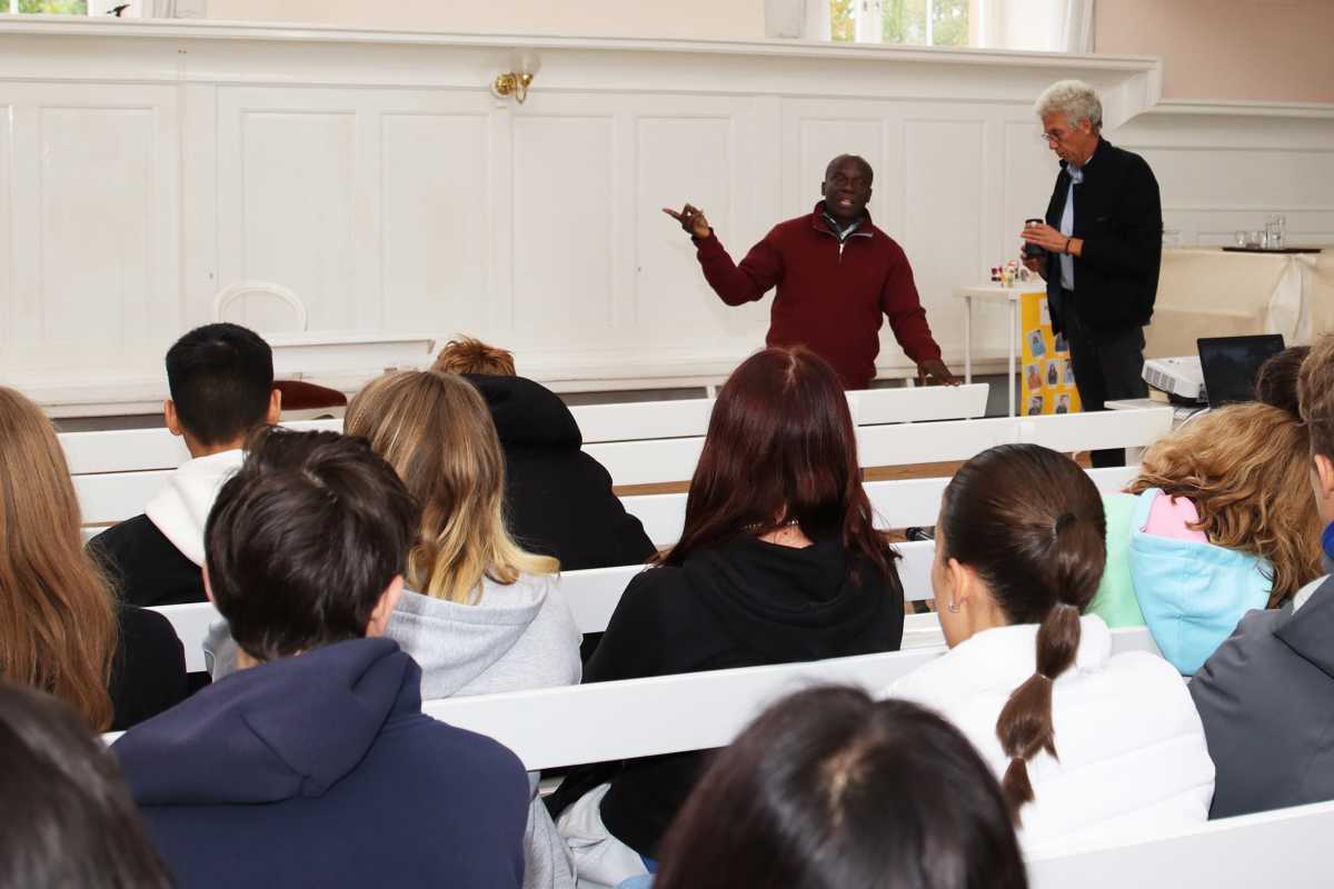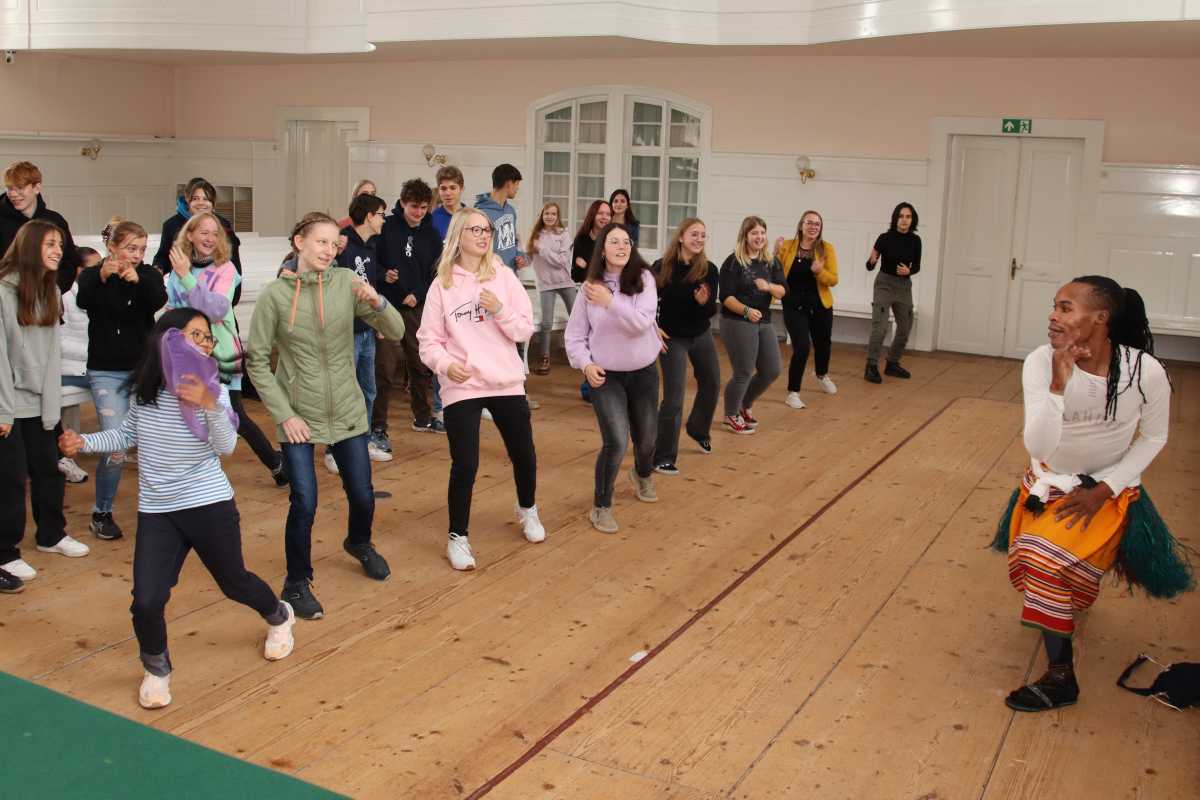 Ihn hatte Micheal Mwase mitgebracht, als er die Zinzendorfschulen besuchte und Schülerinnen und Schülern der achten bis elften Klassen von seiner Arbeit erzählte. Der junge Tänzer war selbst im Alter von etwa zehn Jahren zum Rainbow House of Hope gekommen und ist inzwischen dort als Tanzlehrer angestellt. Die Zinzendorfschüler in Königsfeld konnten nicht nur fasziniert seine Darbietung, sondern auch seine didaktischen Fähigkeiten bewundern. Sie waren begeistert bei der Sache, als er ihnen im Kirchensaal einige traditionell afrikanische Tanzschritte beibrachte.
