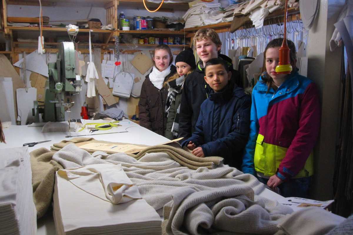 An einer mechanischen Strickmaschine konnten die Jungs und Mädchen die Entstehung einer textilen Fläche mit Naturgarn erleben. Das Garn wurde durch die Schlingenbildung zu Maschen verarbeitet und es entstand vor den Augen der Schülergruppe eine gewirkte, dehnbare und weiche Fläche, welche zu Schlafsäcken weiterverarbeitet wurde. Eine Mitarbeiterin erklärte anschaulich die weiteren Schritte der Textilverarbeitung, z.B. die Schnittgewinnung und die verschiedenen Nähtechniken unter rationellen Gesichtspunkten. „Die Nähmaschinen sehen ja ganz anders aus als die in der Schule“, stellten die Schüler und Schülerinnen fest.