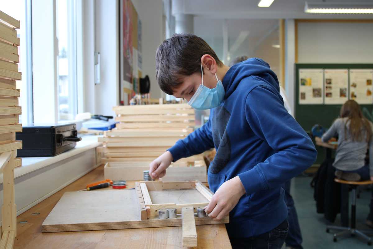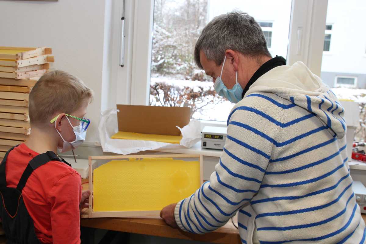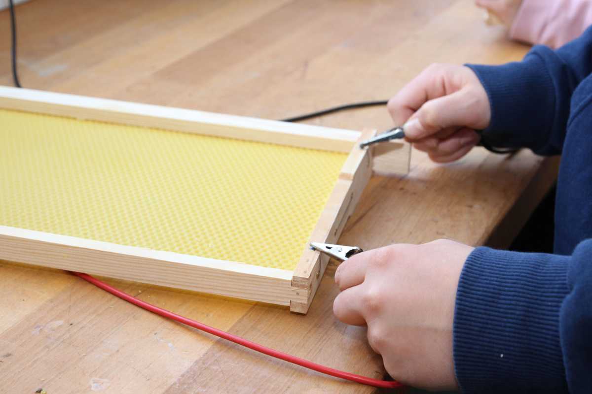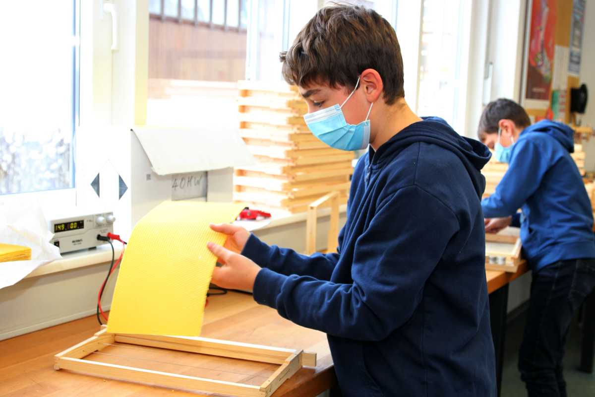 Im Werkraum bauten die Schüler Rahmen für den Bienenstock und füllten diese mit Wachsplatten. „Die Wachsplatten kann man zwar auch bestellen, aber ich stelle sie selbst aus meinem eigenen Wachs her, da weiß ich, wo sie herkommen“, so der Hobby-Imker Gehring.